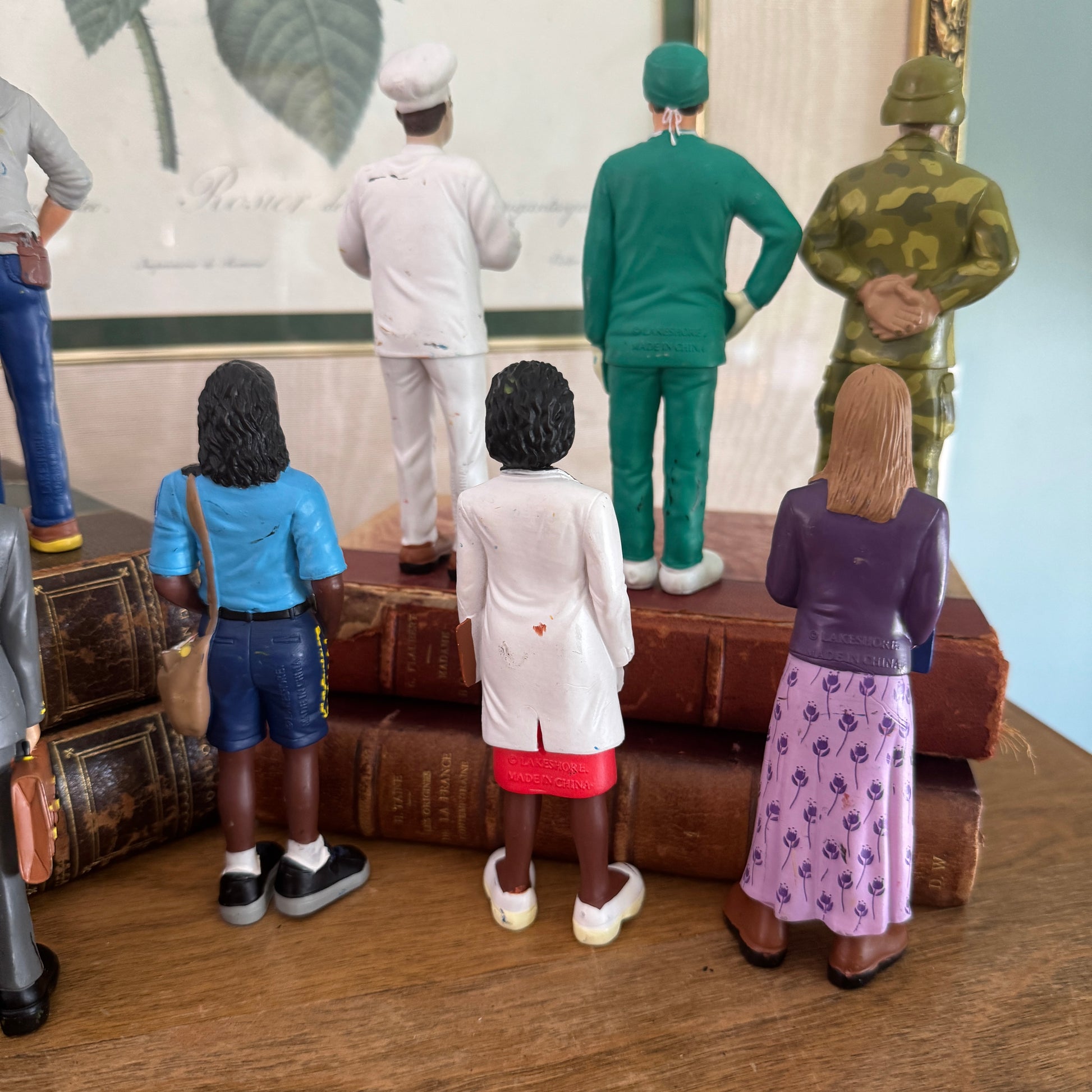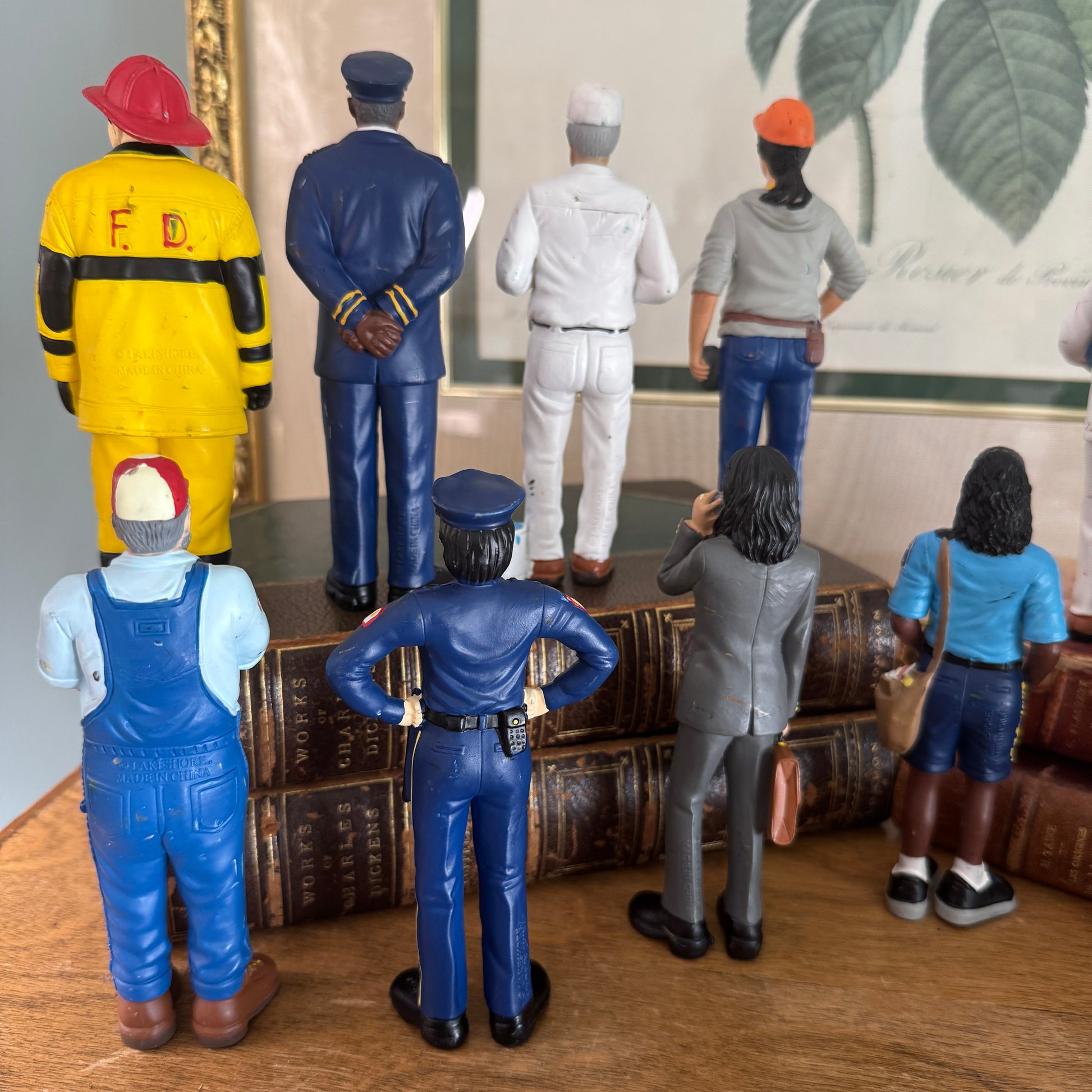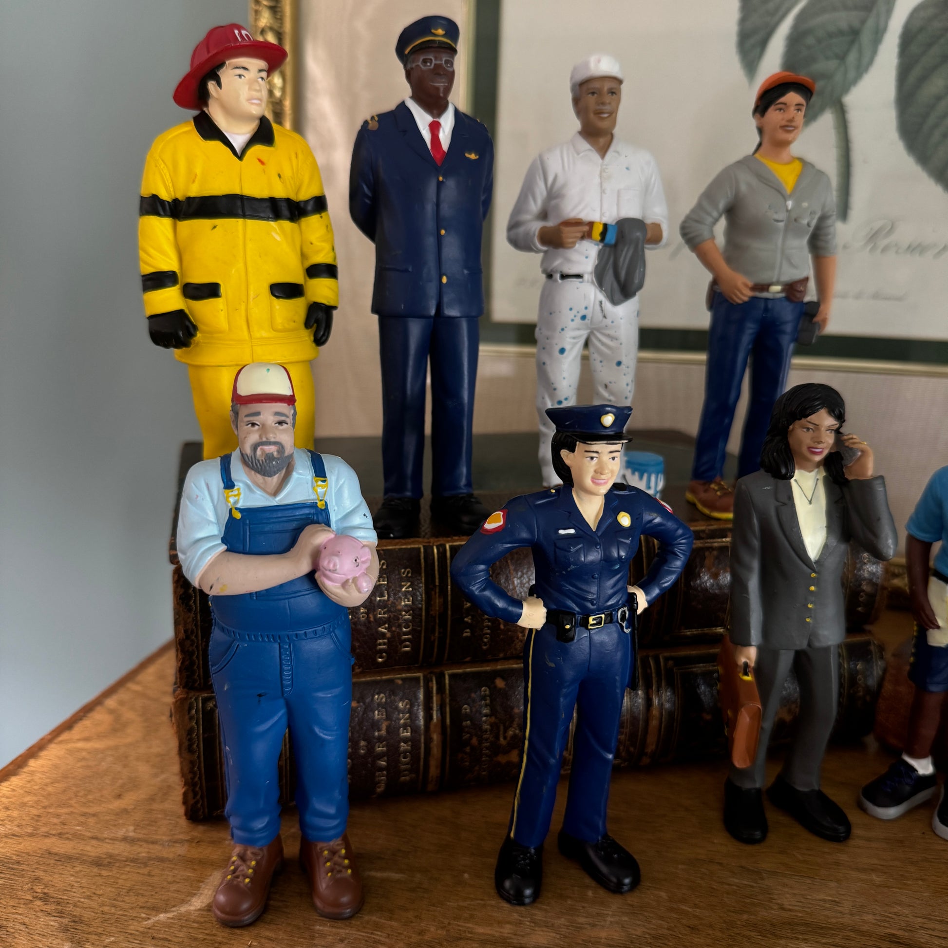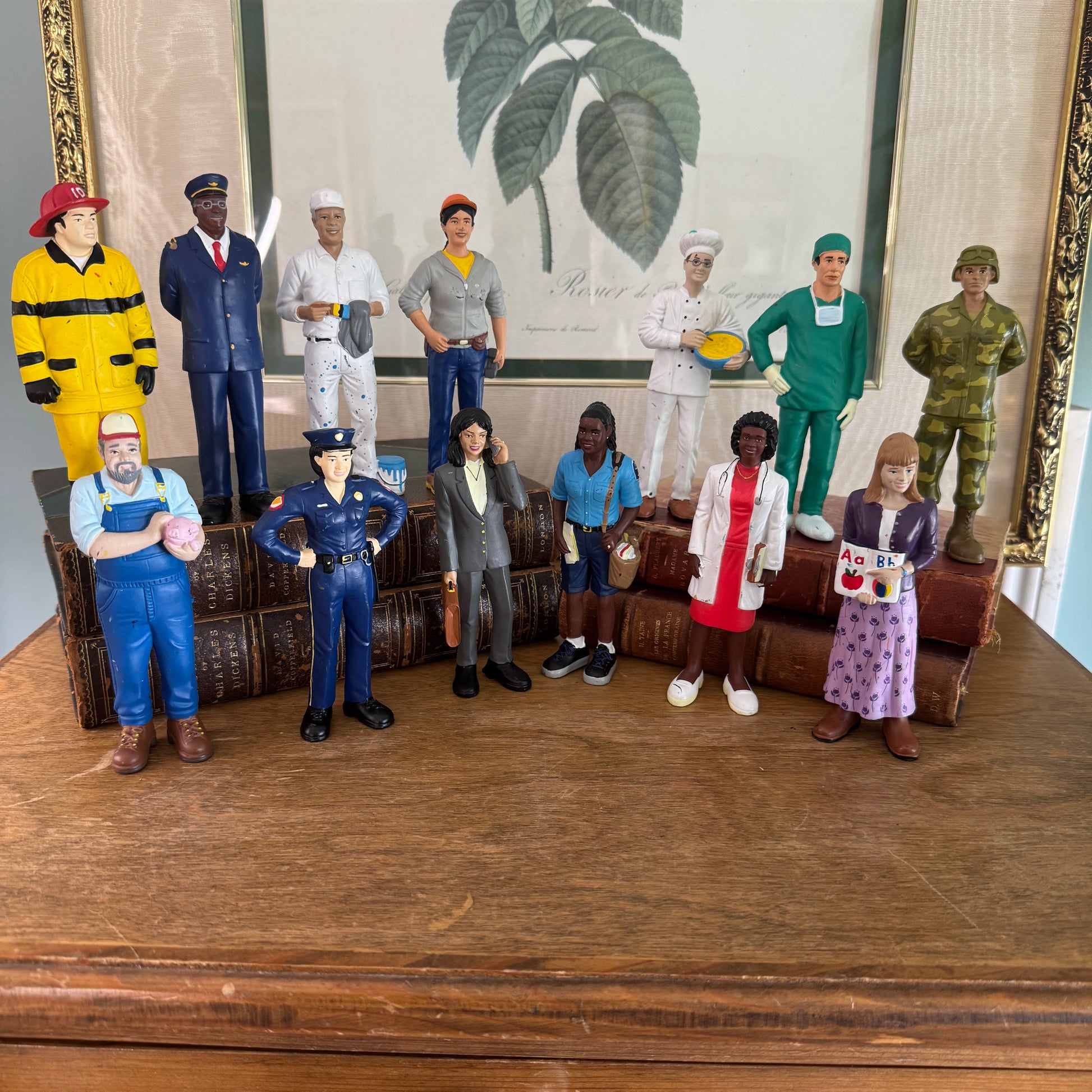 This set includes 12 Lakeshore Learning Community Career Block Play People, with the tallest figure standing 5-1/4" high and featuring the Lakeshore copyright stamp. These play people show minor scratches and marks from previous use, reflecting their durable design for educational play.