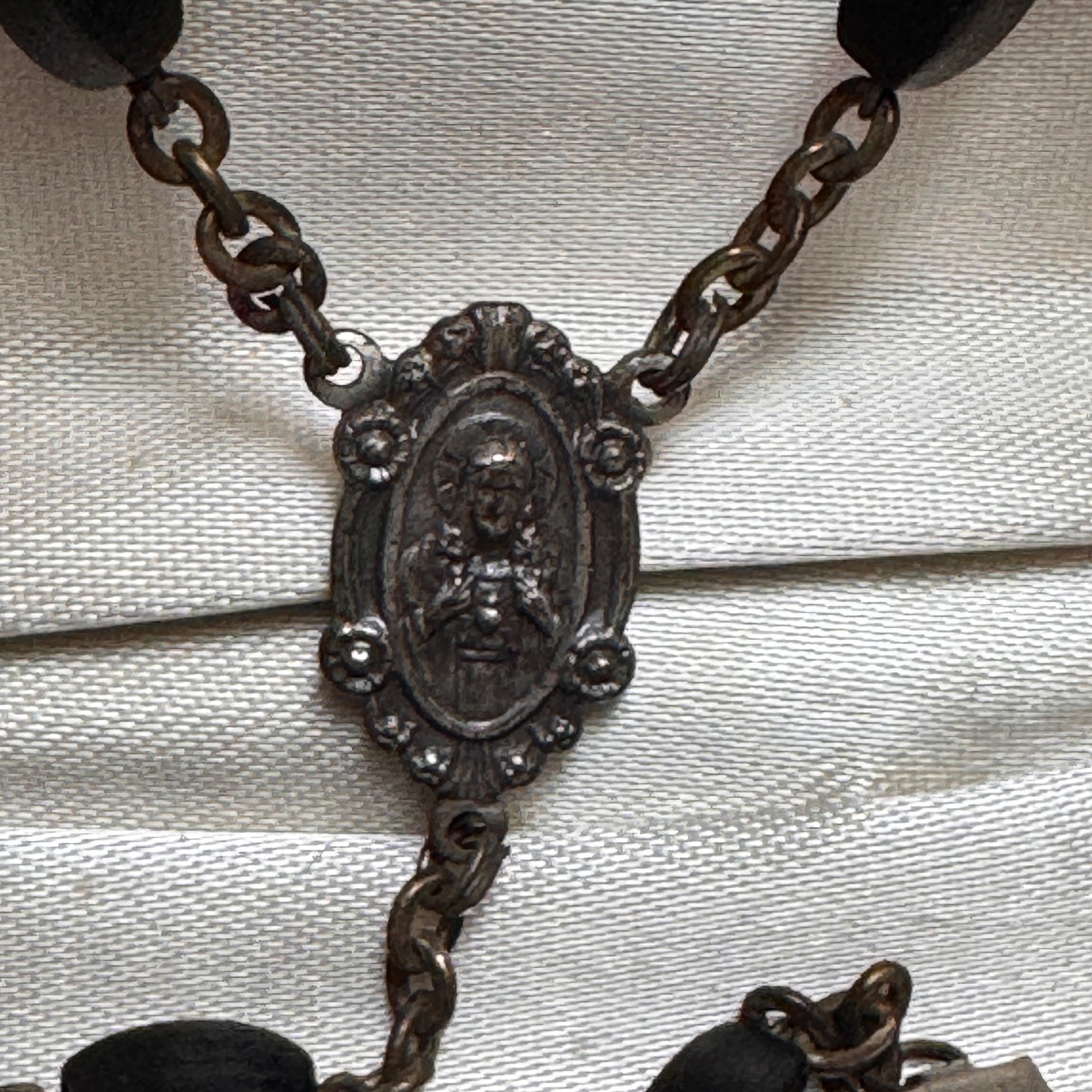 This vintage Italian rosary features finely wired black ebony wood beads measuring 3/8" wide with the rosary measuring 21 inches in length. The center connector elegantly displays Jesus with His Sacred Heart on the front, while the reverse side depicts Joseph and Jesus. The center connector measures 3/4 by 3/8 inches, complemented by a distinctive three-part crucifix measuring 1 inch wide by 1-3/8 inches high, marked “Italy” on the back, reflecting exquisite craftsmanship.