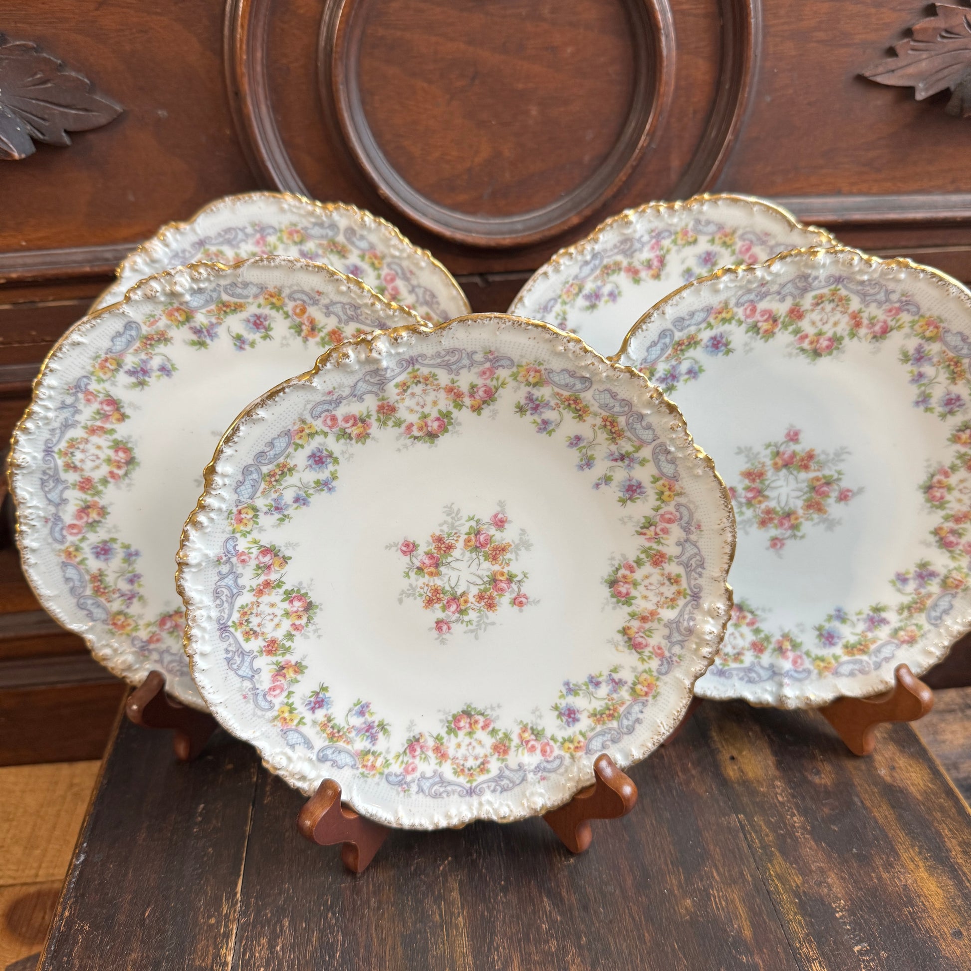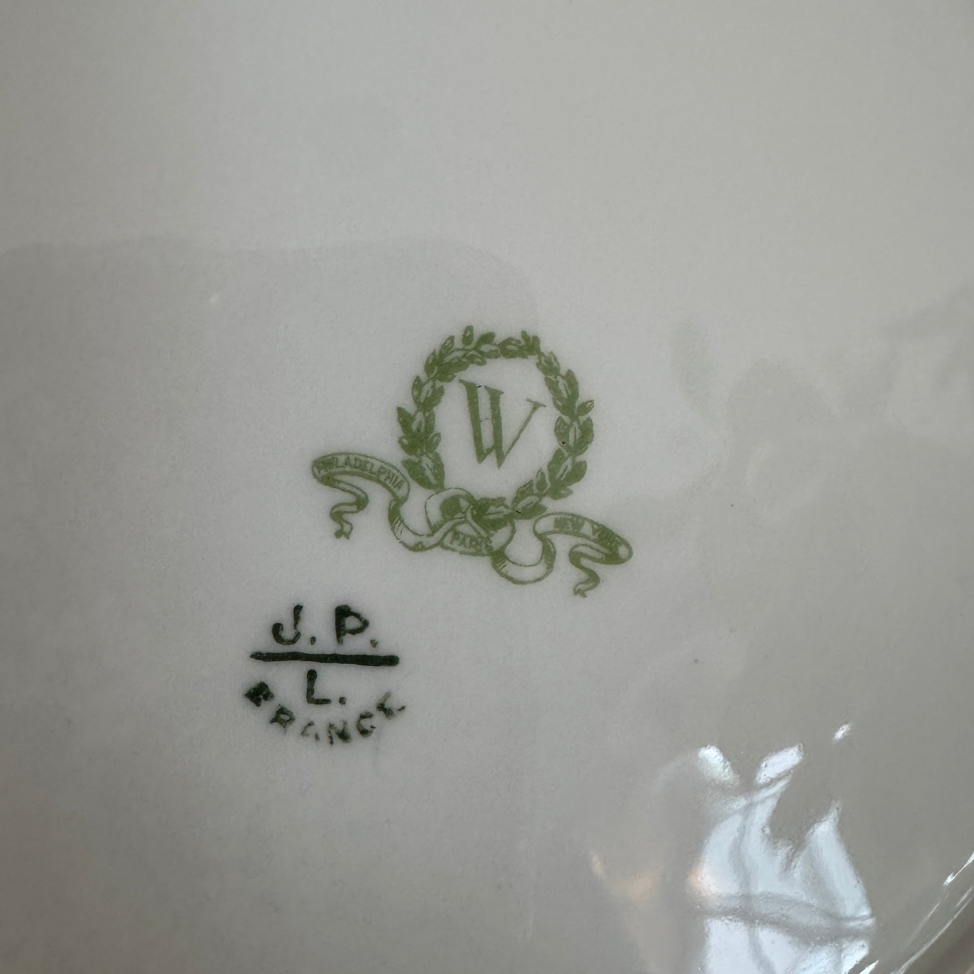 These exquisite antique J.P. & L. Limoges plates features delicate hand-painted flowers and elegant gold trim, showcasing exceptional French craftsmanship. Measuring 7-1/2" in diameter, it bears the J.P. & L mark on the back for Jean Poyat Limoges , including the W wreath Philadelphia since these plates were made for the John Wanamaker Department store in Philadelphia. This mark helps date these antique Limoges plates to the late 19th century to early 20th century. One of the antique plates has a small spot near the outer gilt border and one plate has a tiny chip on the edge. A rare set of collectibles that brings timeless beauty and artistry to any collection.