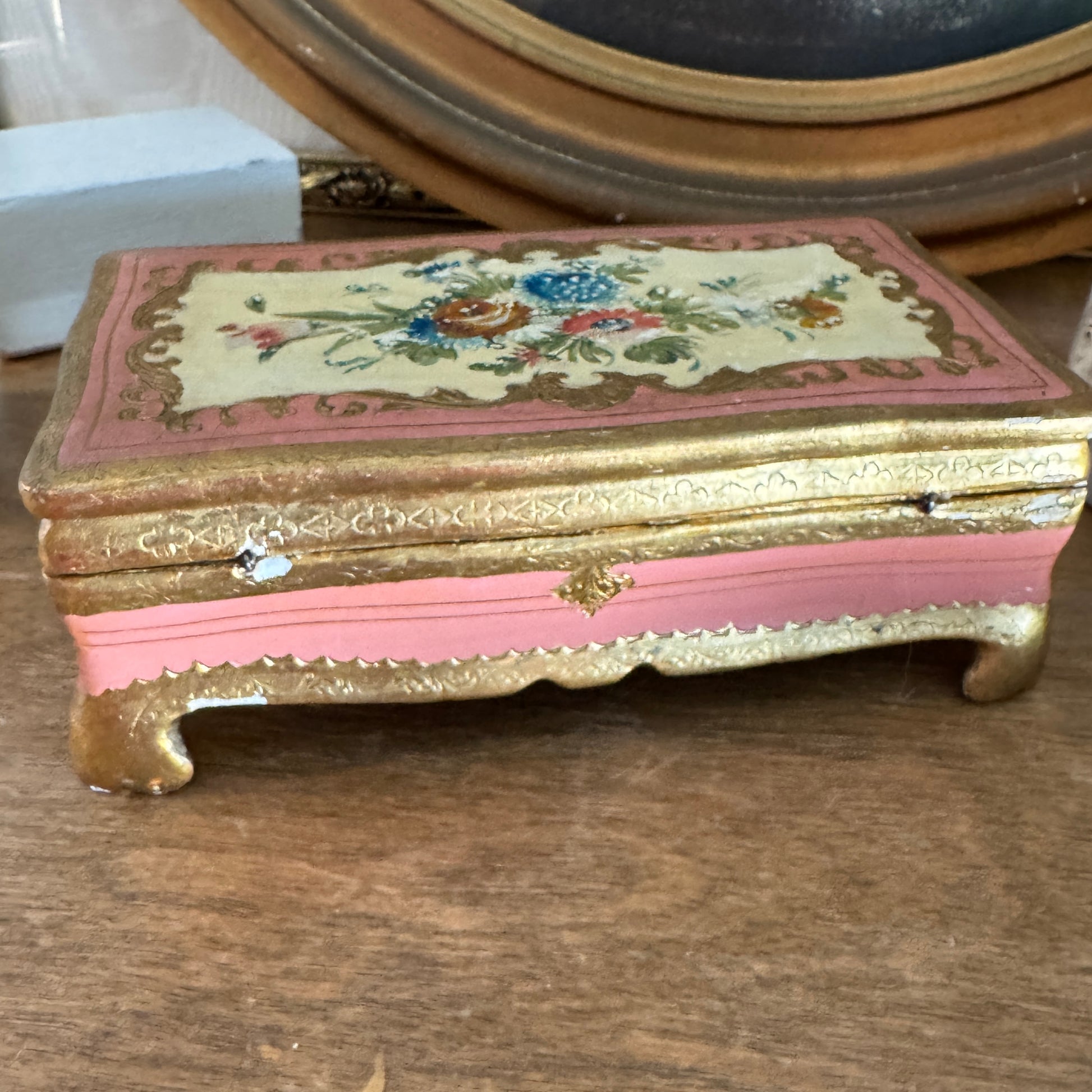 Vintage Italian Gilt & Pink Handpainted Floral Footed Wooden Box