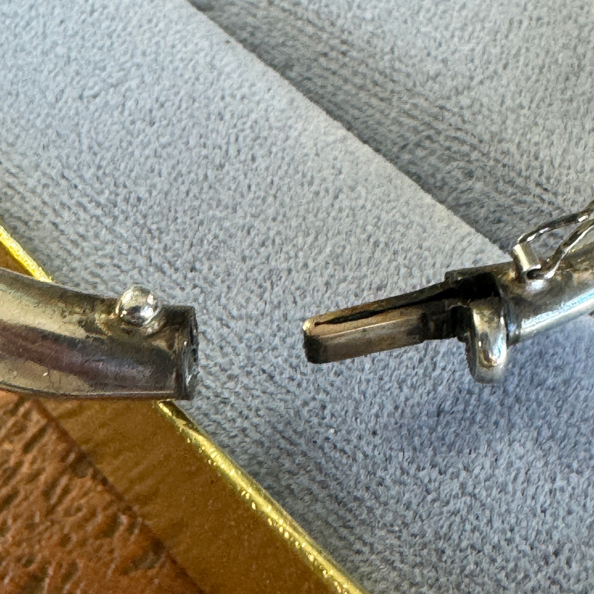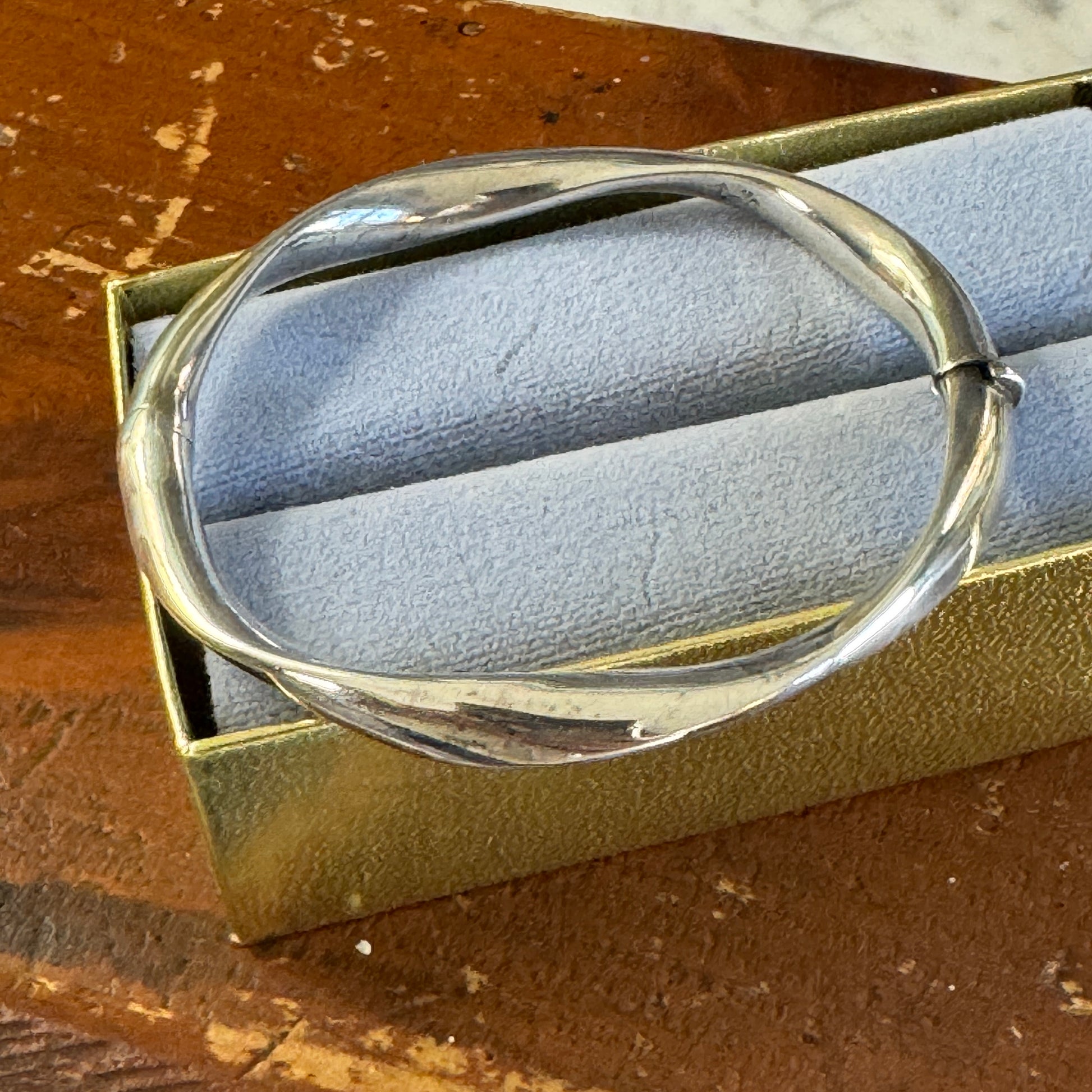 Vintage Italian sterling silver dimensional bracelet has a hidden clasp on the side that opens approx. 2.71" wide to slip over your wrist. This vintage bracelet measures approx. .3" high at highest point , interior dimension of approx. 2.368" wide x 2.1" wide from the section where the latch is set to the opposite side. This vintage Italian sterling silver bracelet weighs 15.48 grams and is stamped Italy, and sterling.