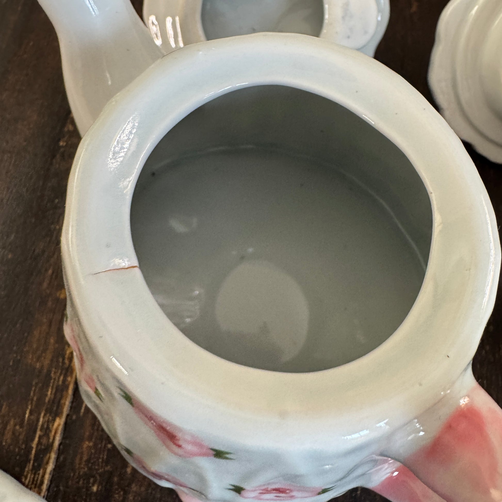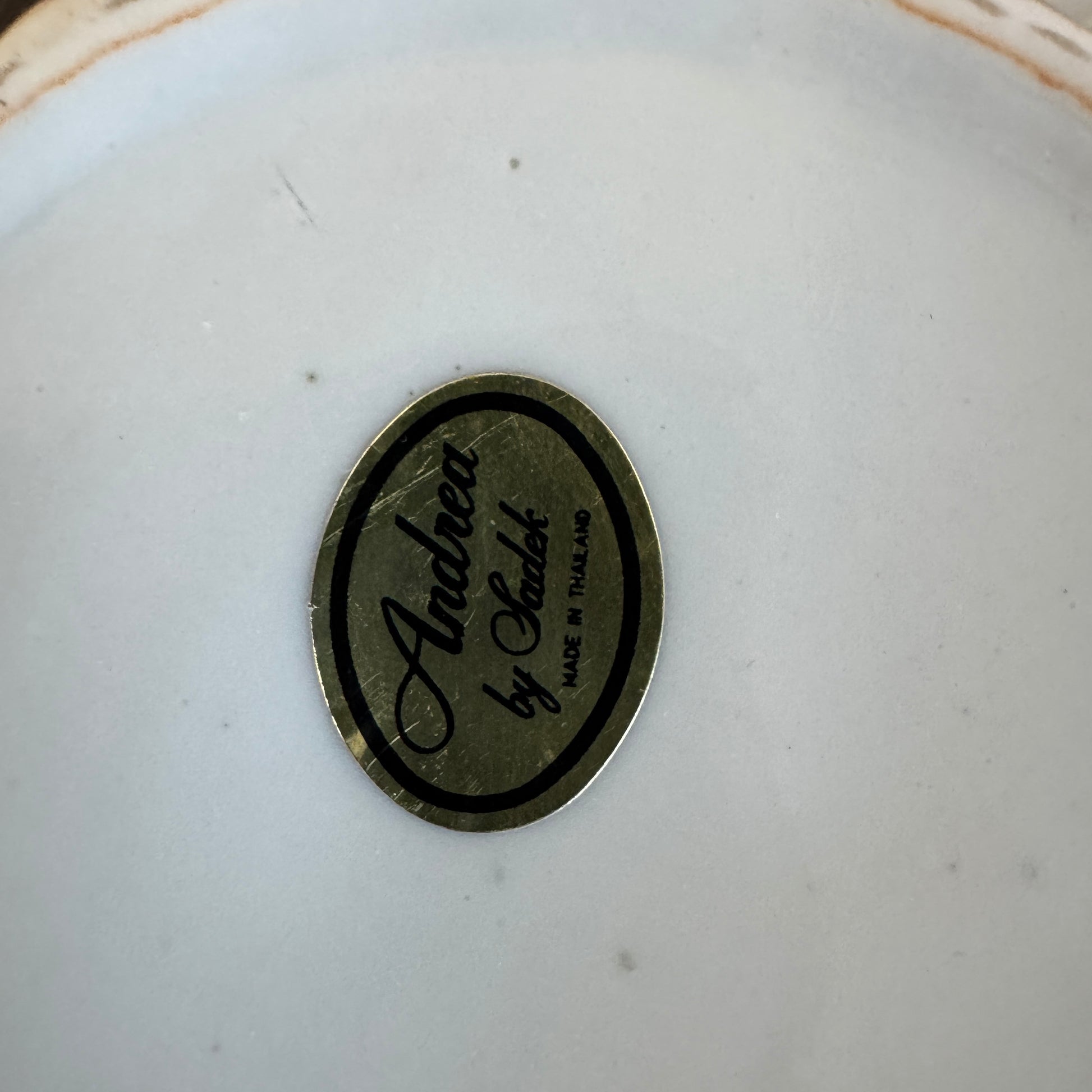 This set features four delightful Andrea by Sadek miniature floral tea pots on lids. Three retain their original Andrea by Sadek labels on the bottom, ensuring their authenticity. One tea pot has a minor factory defect inside the lid, which does not detract from its charm. Each miniature rose tea pot measures approximately 6" wide from handle to spout, stands 3-3/4" tall at the highest point, and has a 3-1/2" base. Perfect for adding a touch of vintage elegance to your collection or display.