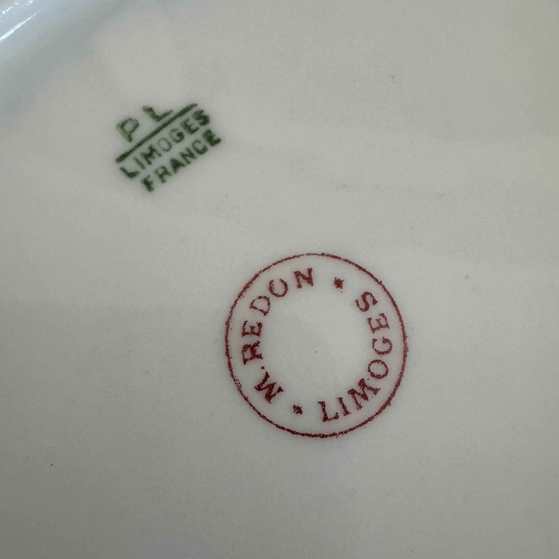 This elegant set includes three French P & L Limoges bread and butter plates featuring the classic Fleur de Lis design with a refined gilt border. Each plate measures 6-3/8" in diameter and is marked on the back with P & L Limoges, France, and M. Redon Limoges, confirming its authentic craftsmanship. Perfect for adding a touch of sophistication to your table setting.