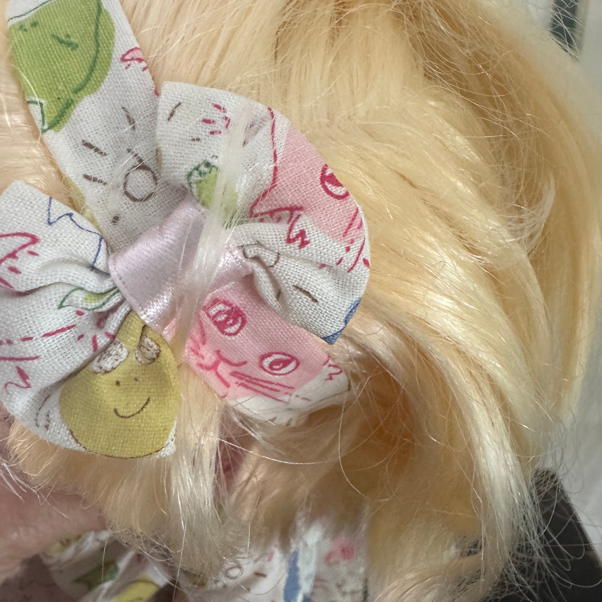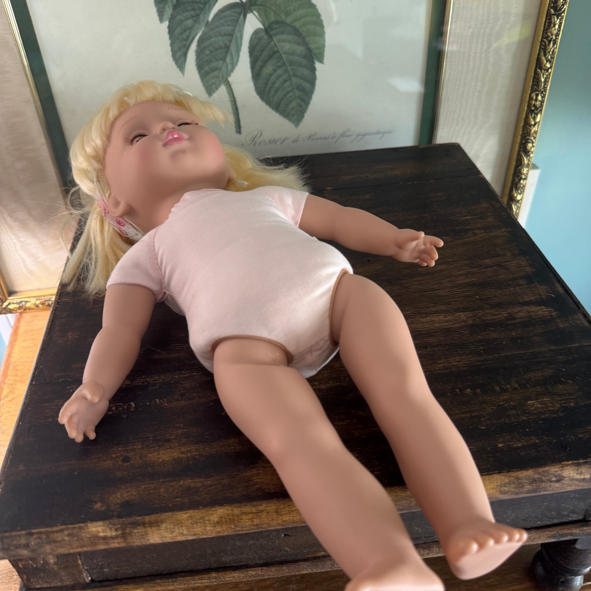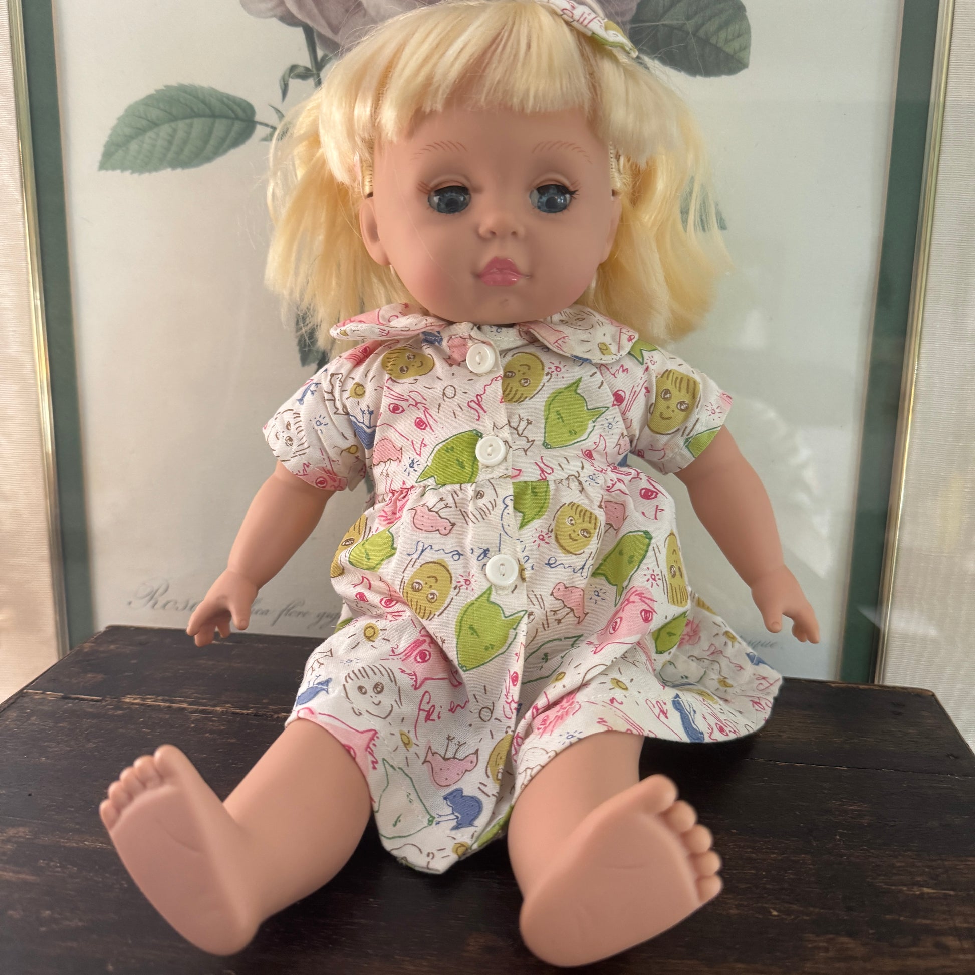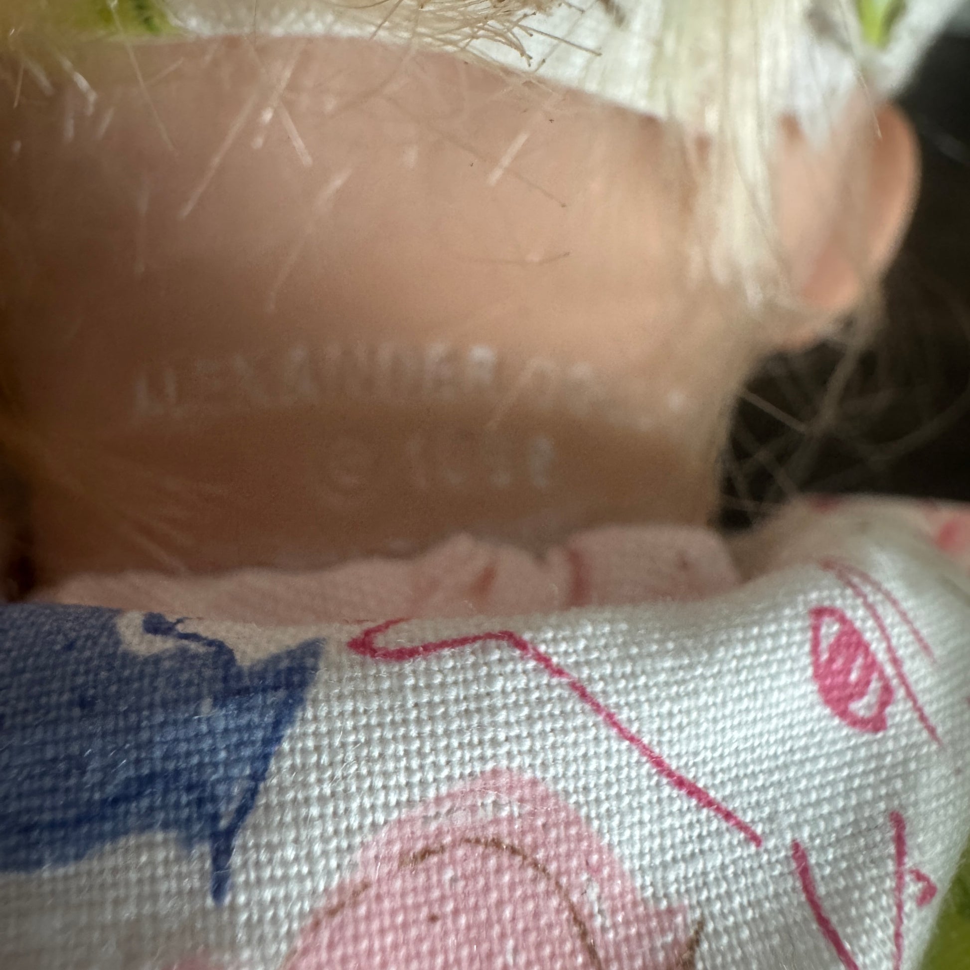 Vintage Alexander Baby Doll from 1999, featuring a unique Yoko Ono dress and matching headband. This collectible doll, marked by the Alexander Doll Company and dated on her neck, stands about 15" tall with functioning eyes that open and close. The outfit displays charming images of cats, baby chicks, dogs, and people, alongside the word "friends" in delicate script. The dress bears John Lennon and Yoko Lennon labels, adding to its authenticity. With a small mark below her lips and a slight lash separation, this doll is a rare find for enthusiasts seeking character and history.