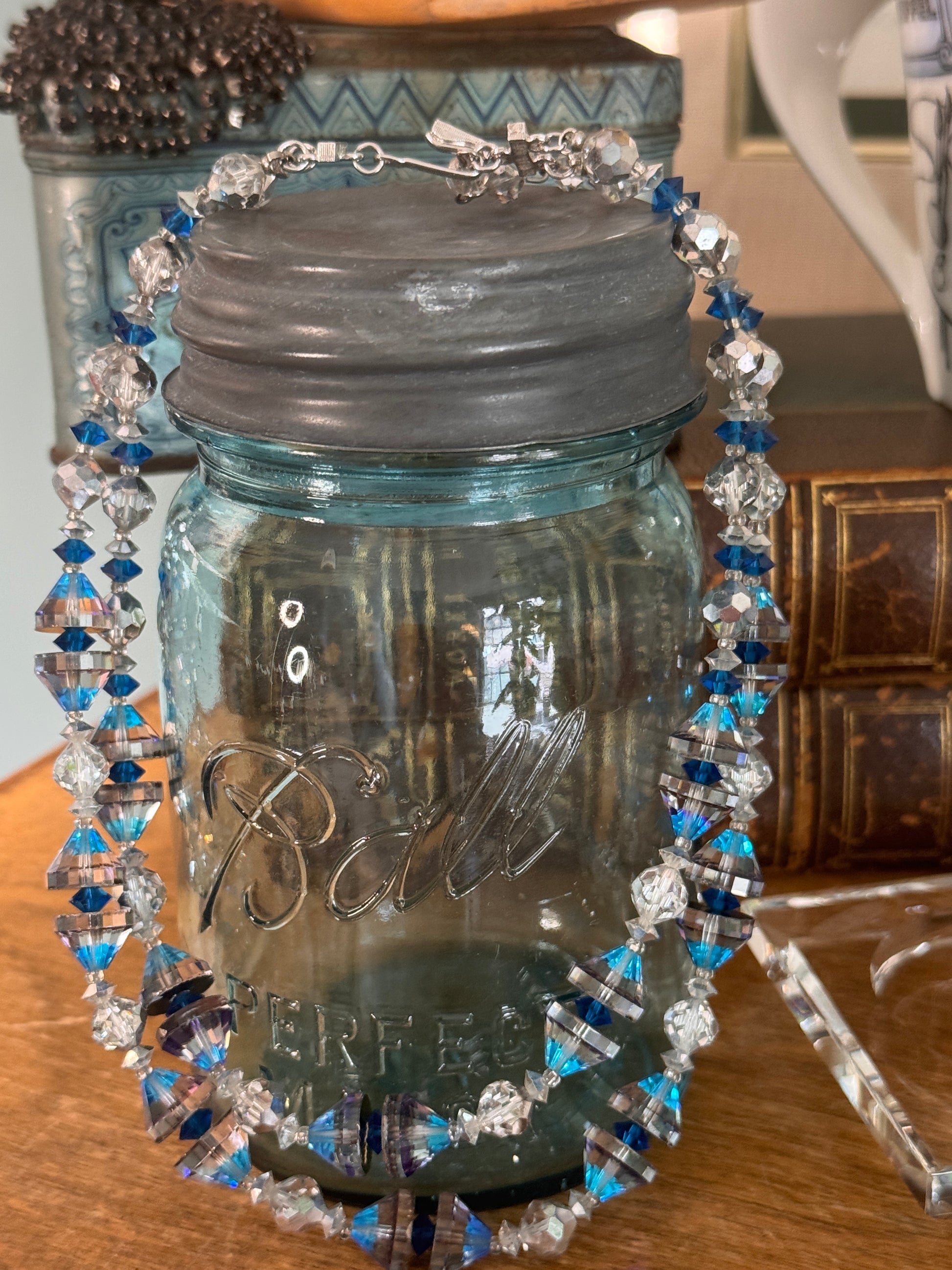 Vintage Vendome MCM Silver Blue Double Strand Glass Bead Necklace