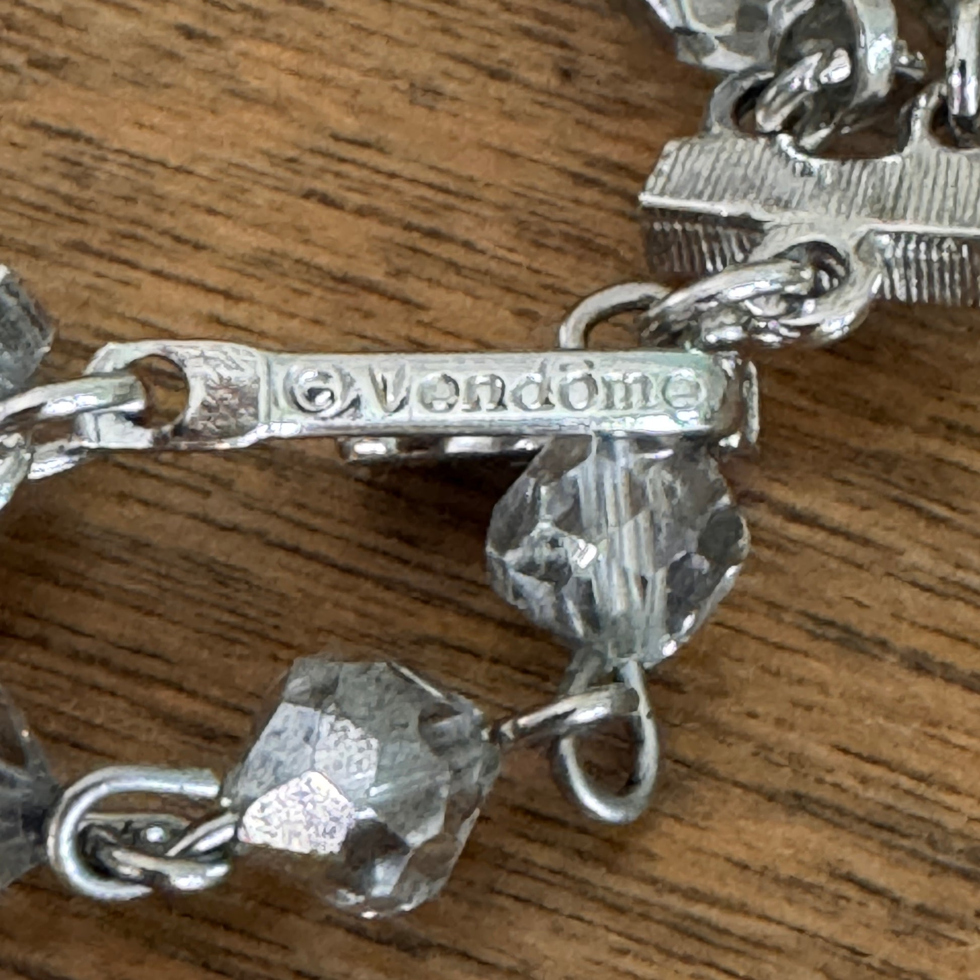 A quintessential mid-century Vendome creation featuring two graceful strands of luminous, multi-faceted silver glass orbs intermingled with artisanal blue and purple glass elements. This distinctive piece is authenticated by the Vendome signature on its refined hook clasp, complemented by an adjustable extender that culminates in a silver-plated fleur de lis embellishment. The primary strand offers a customizable length from 14" to 17", while the companion strand descends at a precisely calculated ¾" interval, creating a dimensional silhouette that exemplifies the sophisticated craftsmanship of this bygone era.