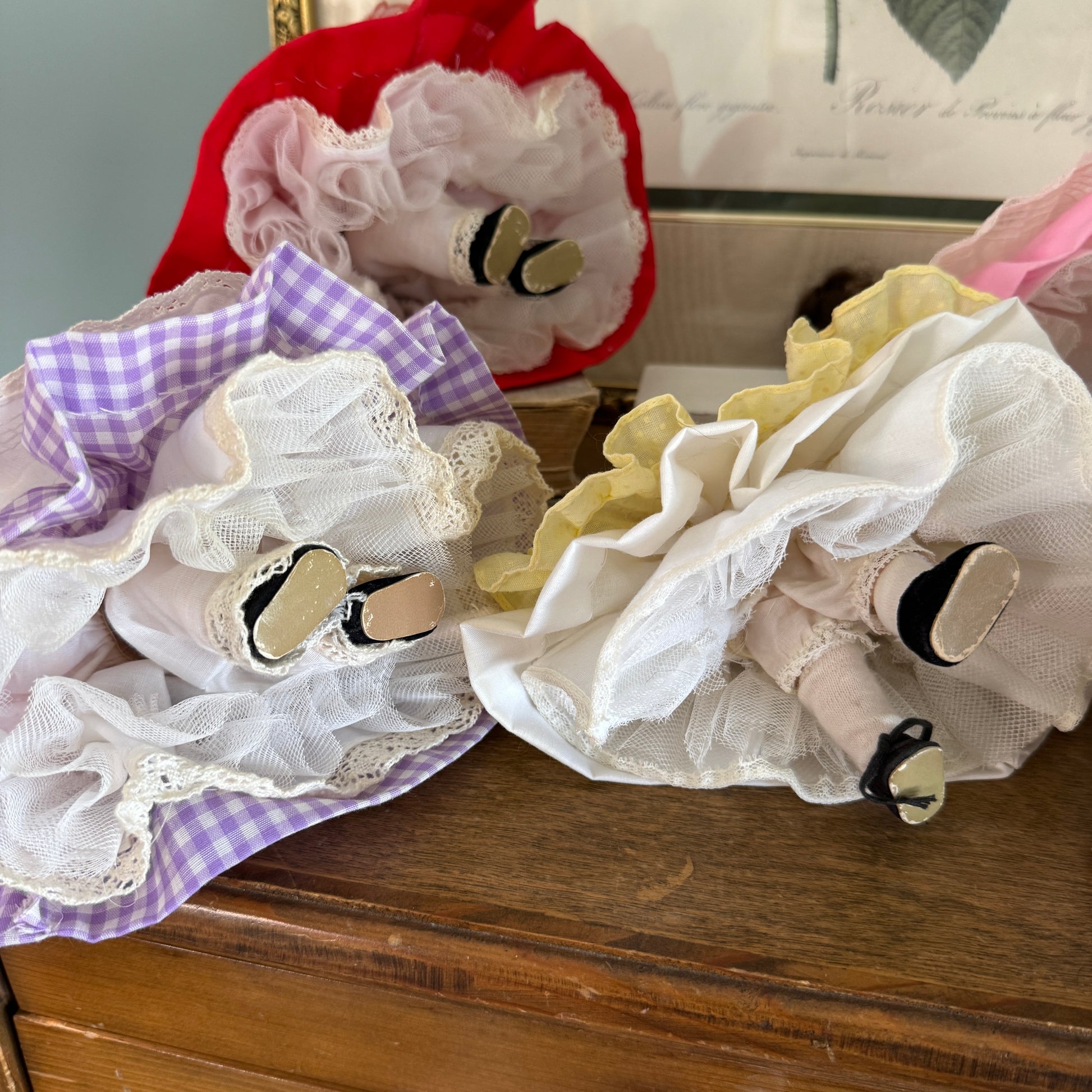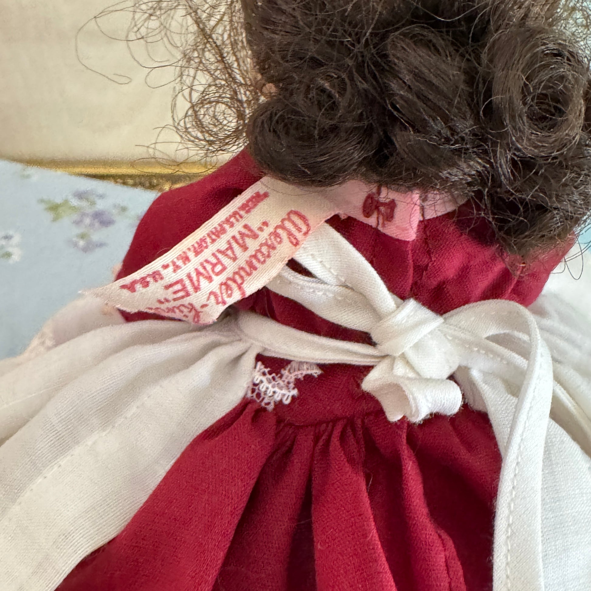 This delightful set comprises Madame Alexander’s signed Alexander-Kins dolls depicting the Little Women from the book written by Louisa May Alcott includes characters Marmee, Meg, Amy, Jo, and Beth, each standing 8 inches tall. Two dolls exhibit red dye marks, and the bloomers across all dolls have lost their elasticity. Marmee’s hat is missing, and while every doll wears shoes, two pairs lack straps and one shoe differs in style. The clothing remains clean, and the dolls’ bodies are preserved in good condition. This collection offers a valuable vintage ensemble with noted condition considerations for collectors.