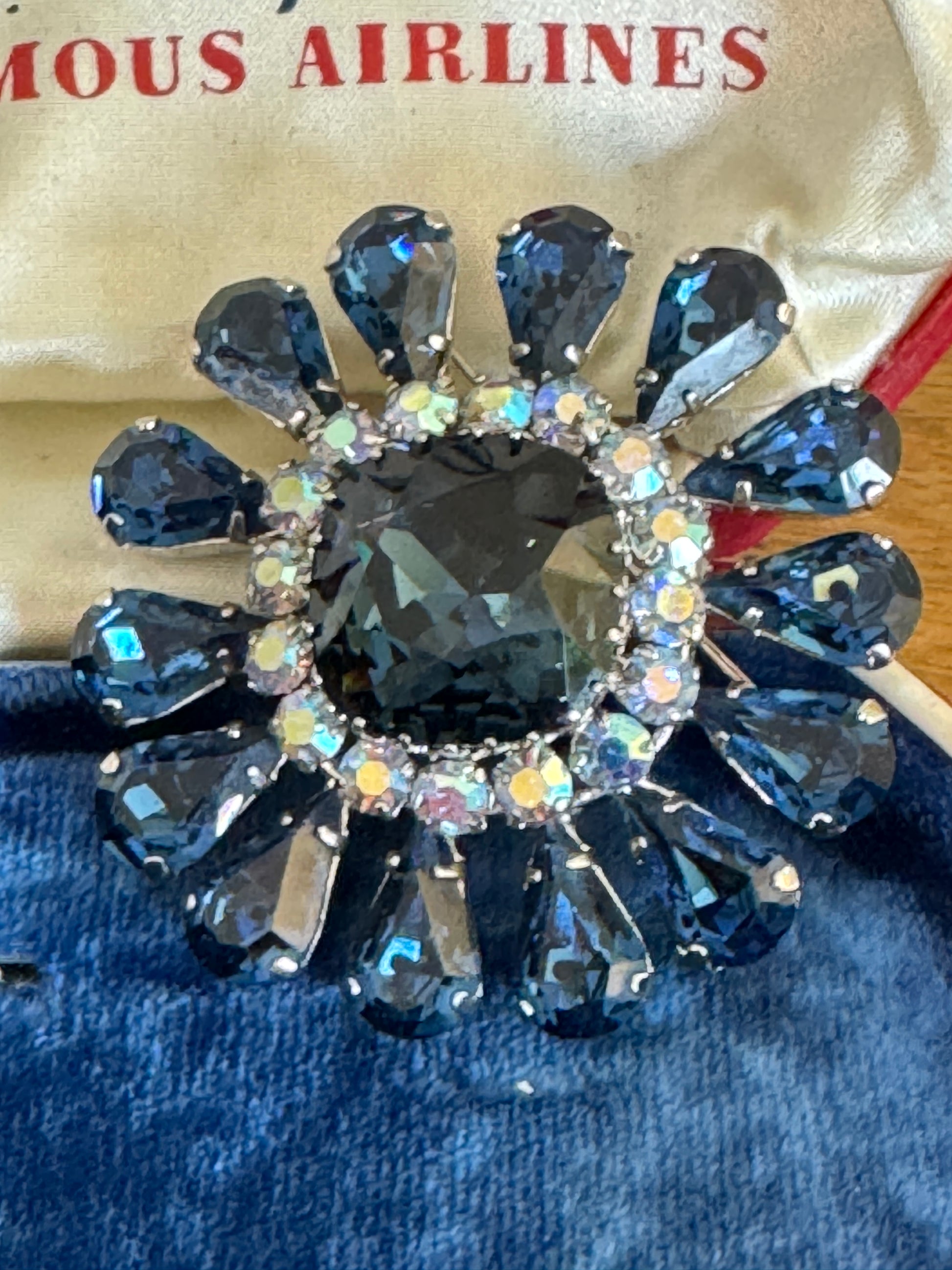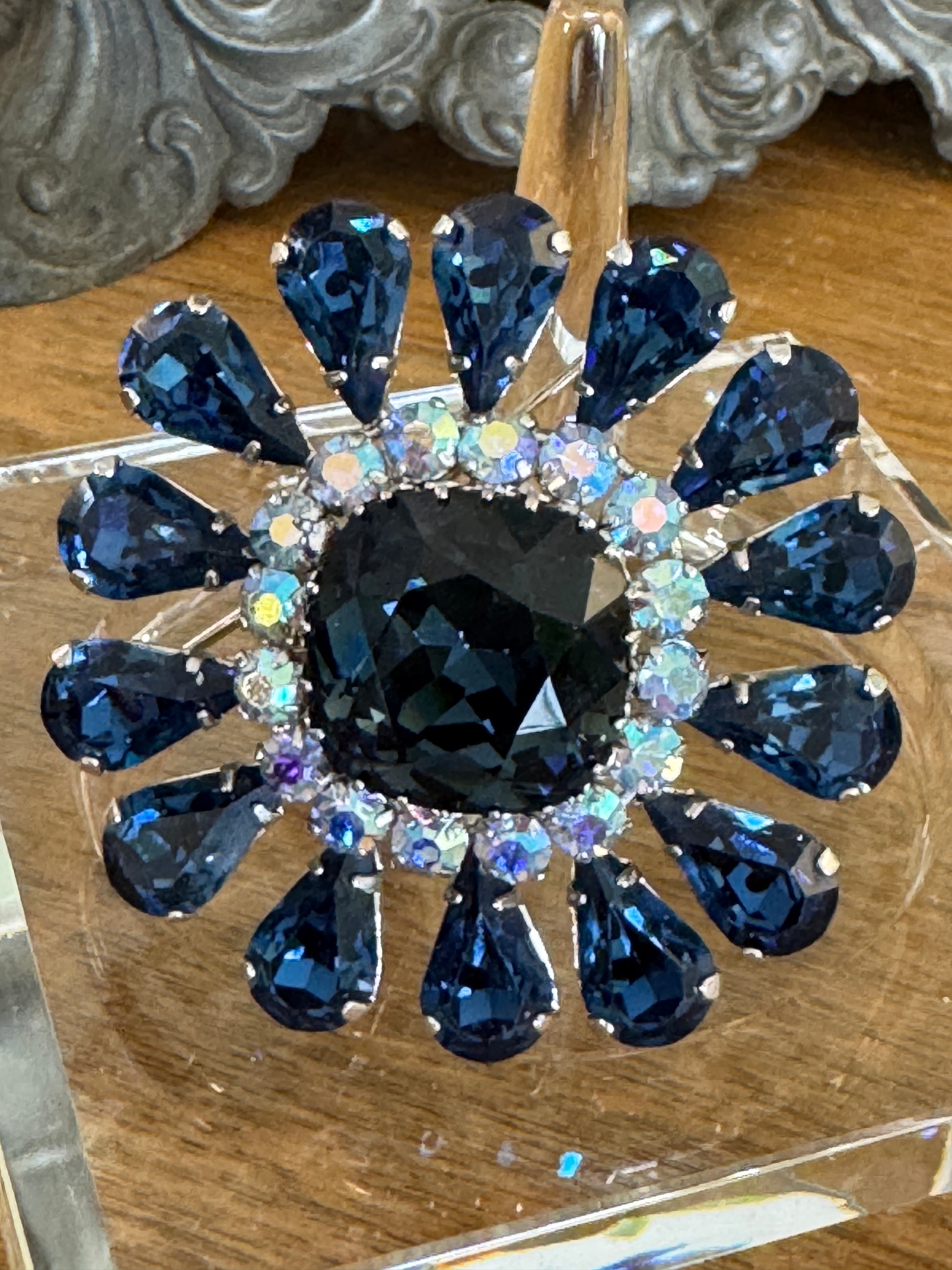 Vintage Austrian Sapphire Blue Multi Faceted Rhinestone Flower Pin