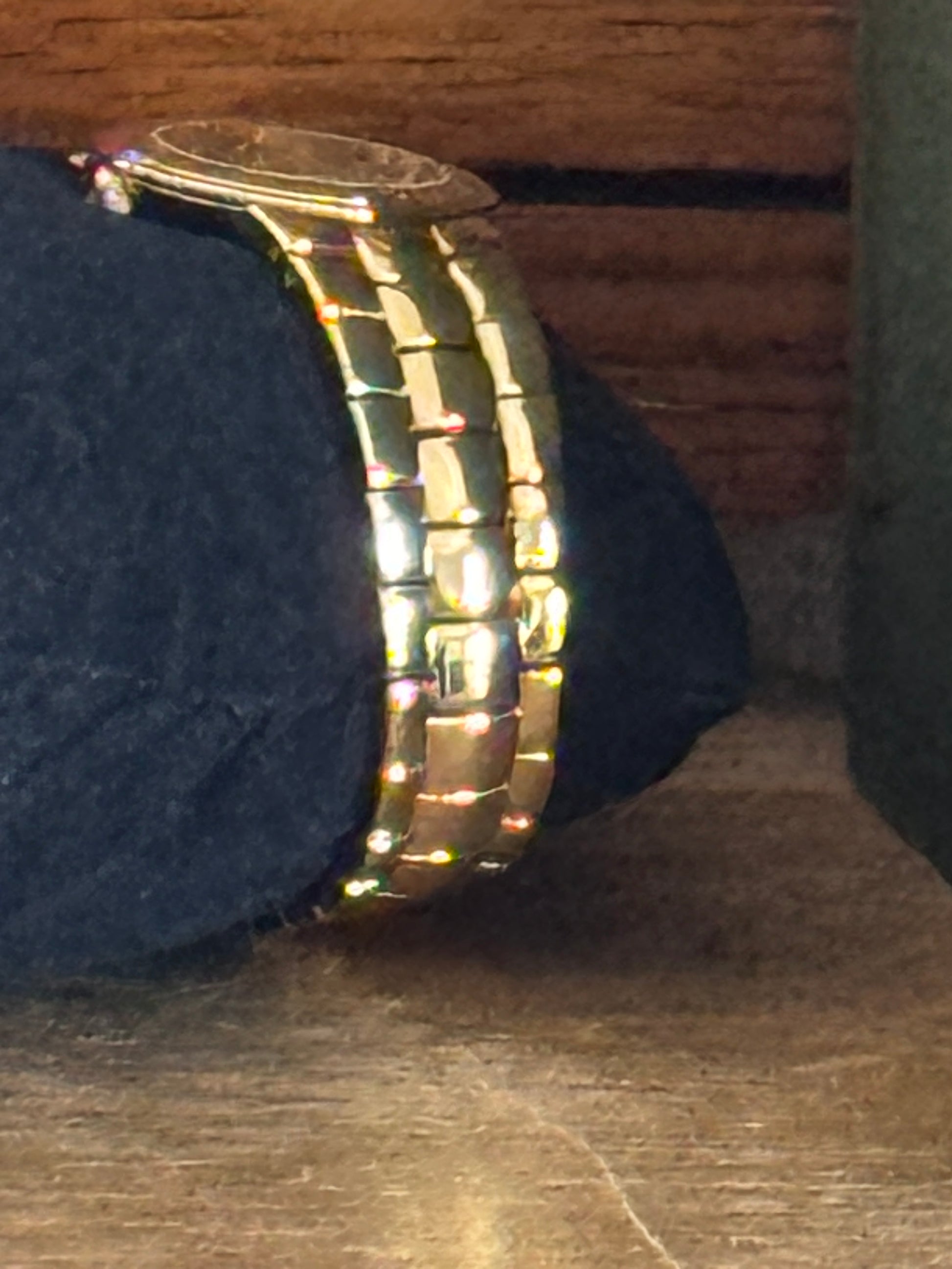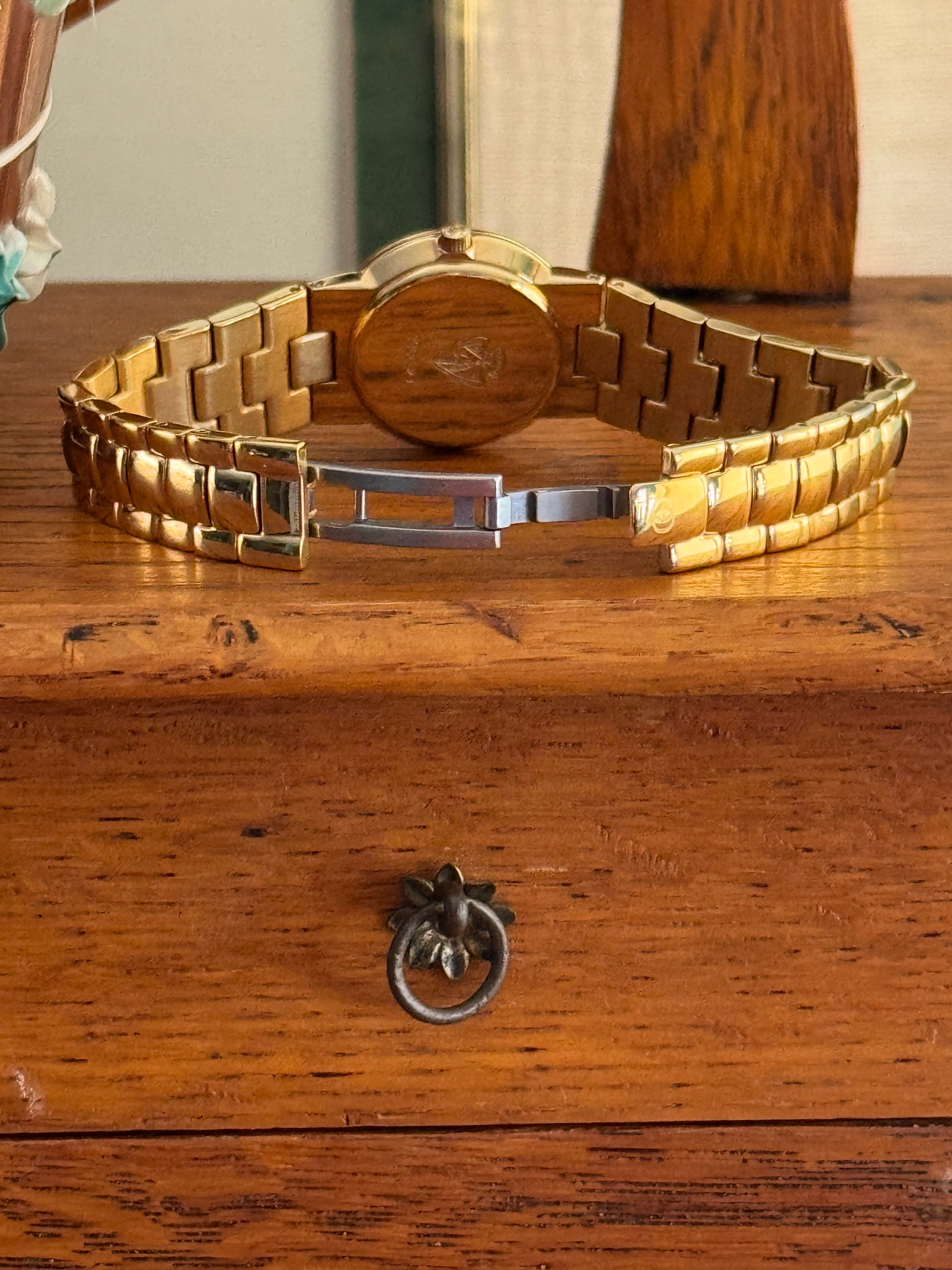 Vintage Gucci Ladies Gold Plated 3300.2.L Quartz Watch Black Dial Diamond Hour Markers. Beautiful vintage ladies Gucci gold plated Swiss quartz watch with diamond markers, Roman numerals engraved on the bezel, the name "Gucci" apprears at the top. The watch case measures approx. 24 mm wide x 25 mm long x 6 mm deep. The bracelet measurement without the watch case measures approx. 6-1/8" and comes with three additional links (and two pins) which could add another 1-1/8" to the watch length.The watch is in working condition and has a new battery just placed, should the cold wear out the battery the buyer will need to replace the battery themselves. The watch is no longer waterproof. The watch is in near mint condition with minimal scratches from use.