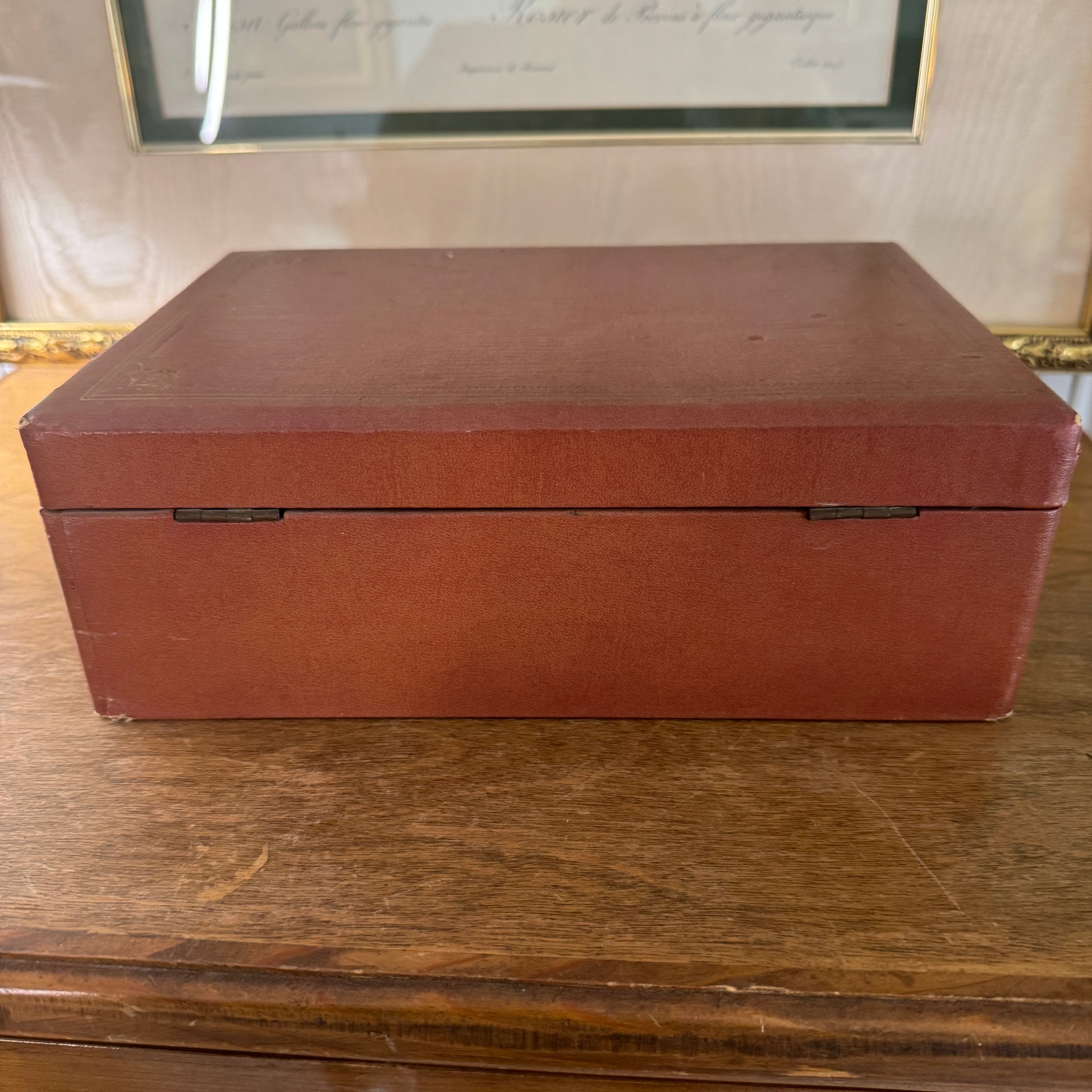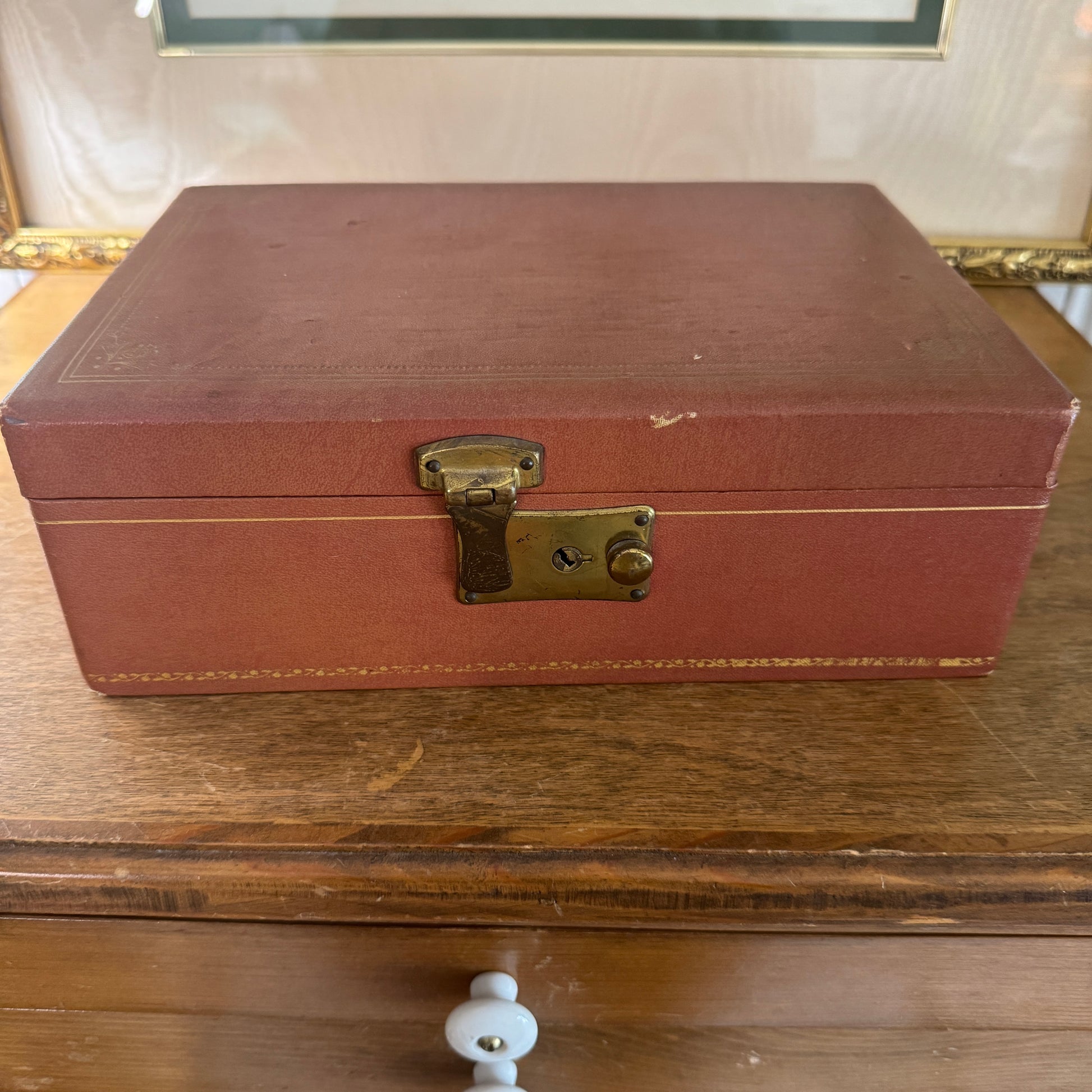 This vintage Mele jewelry box features a plush emerald green velvet-like interior with two tiers designed to organize your jewelry beautifully. The top tier is perfect for smaller treasures, with a central slot for rings, while the bottom tier can neatly store necklaces and bracelets. Its secure latch folds down and snaps shut to keep your valuables safe—note, no key is included. The exterior shows some minor wear on the leather-like fabric, adding to its vintage charm and it's gilt details. Measuring about 10" x 3.5" x 7", this elegant box combines classic design with practical storage.