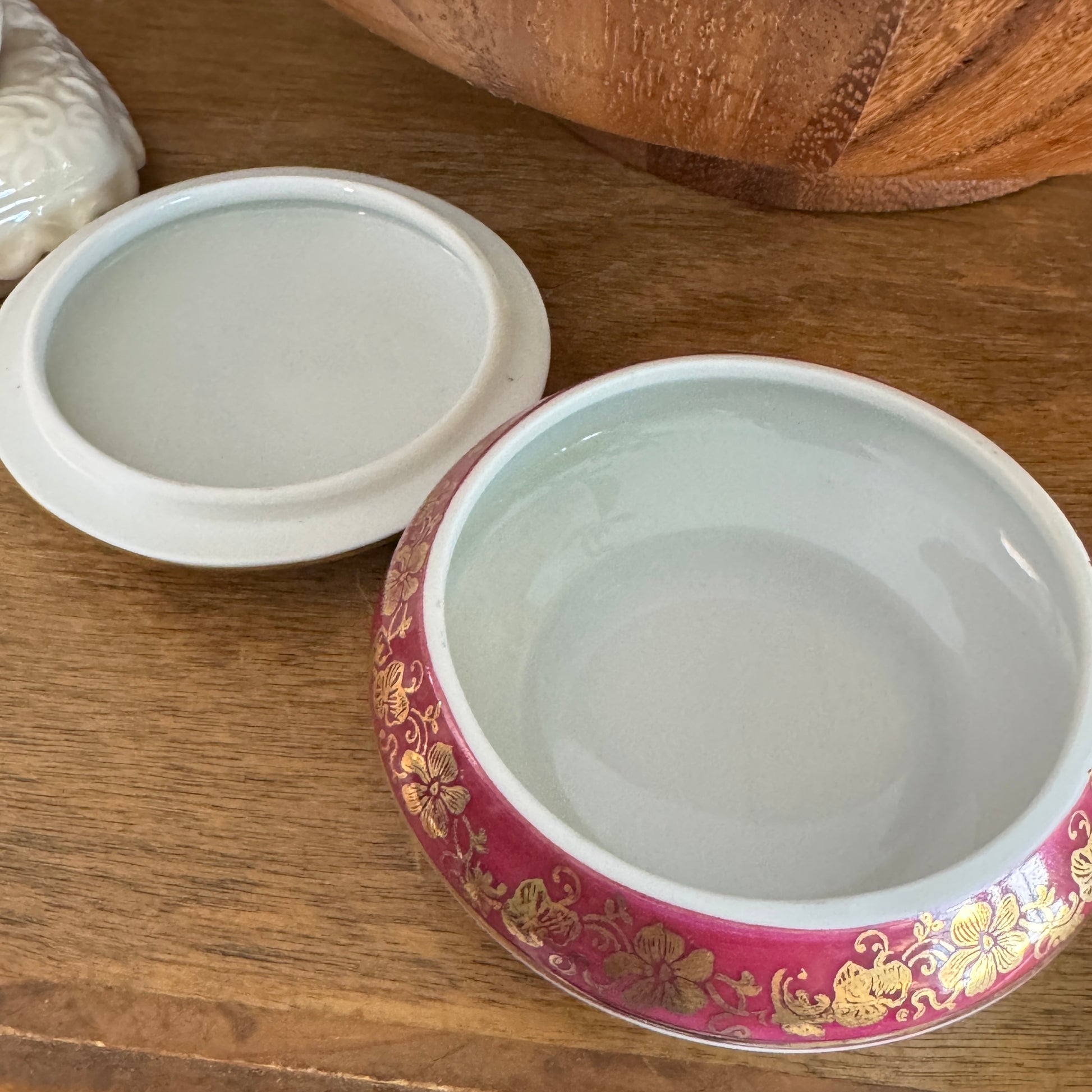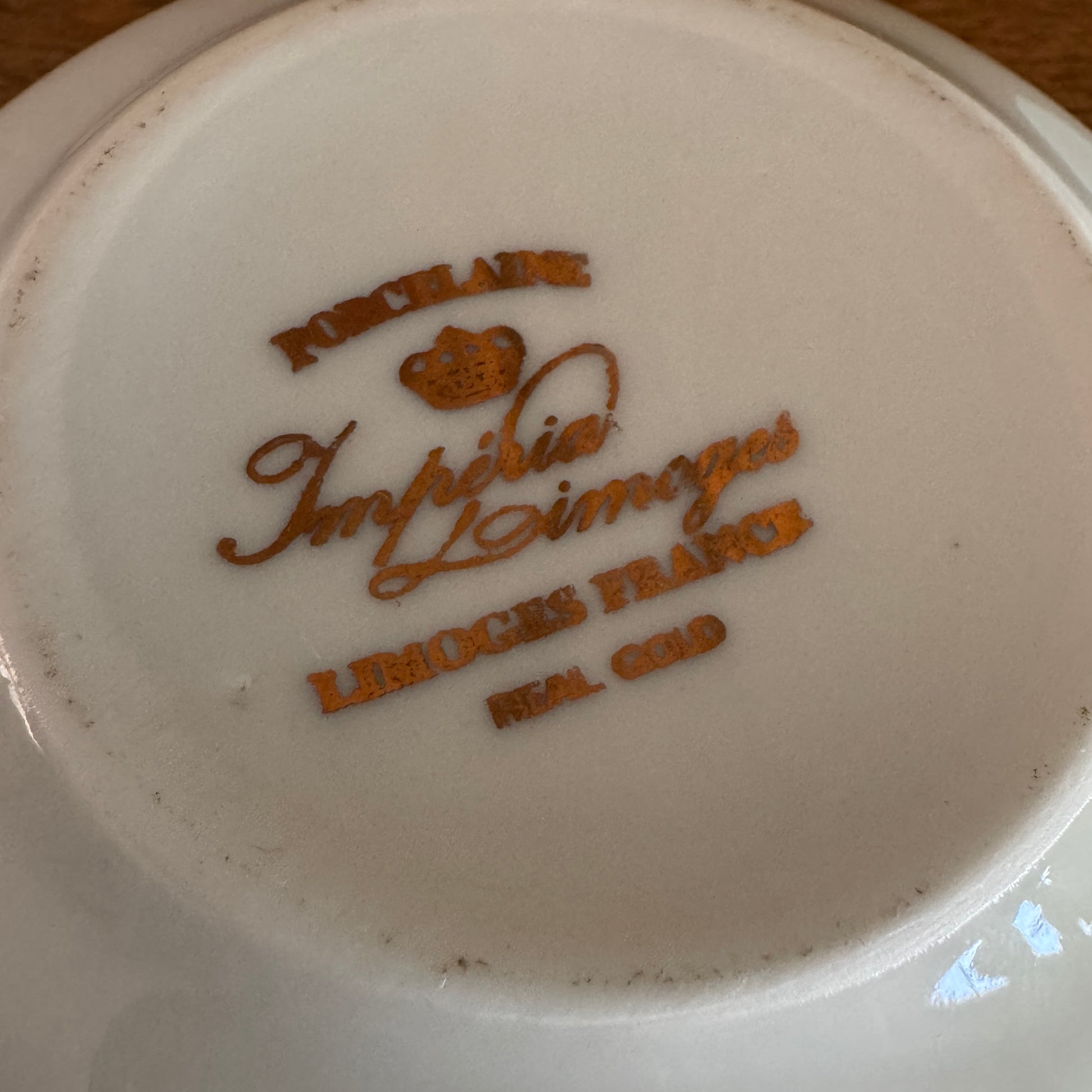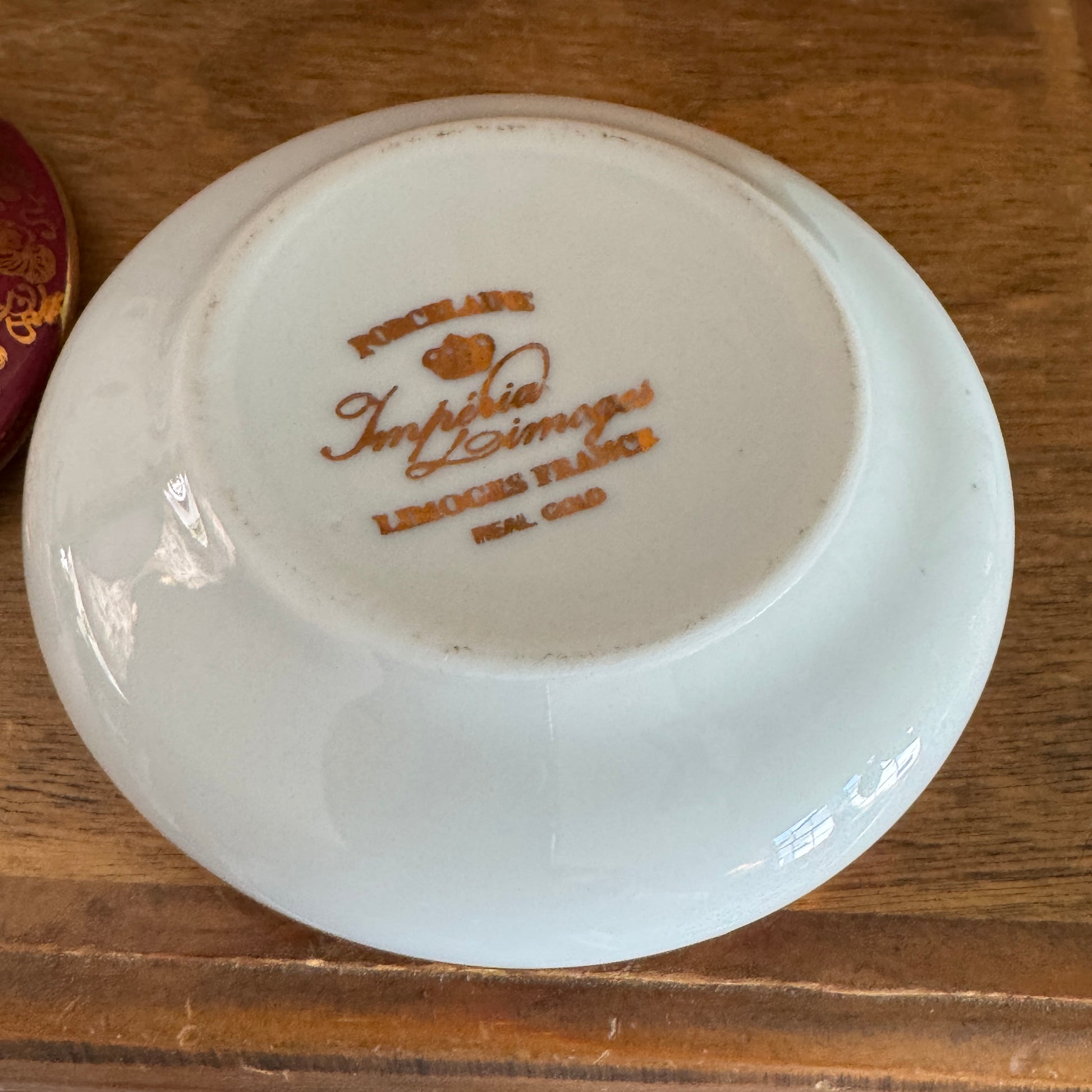 This charming Vintage French Imperial Limoges Fragonnard Trinket Box features a stunning Fragonnard image on its lid, accented with delicate floral patterns highlighted in genuine gold. Measuring 3.34" wide by 1.63" deep, this elegant round box is crafted in Limoges, France, proudly marked with Porcelaine, Imperial Limoges, and real gold on its base. A perfect blend of artistry and heritage, it makes a captivating addition to any collection or a thoughtful gift.
