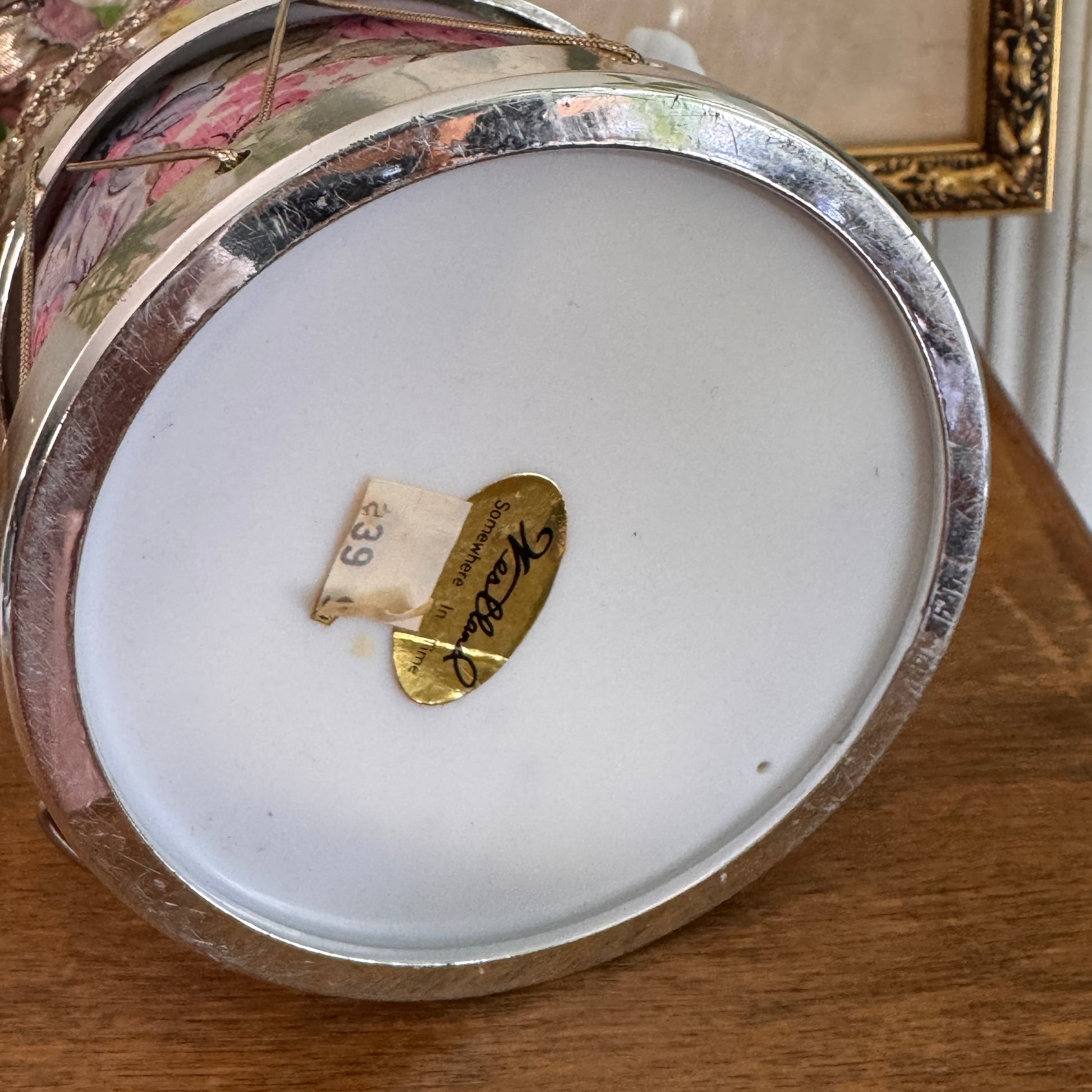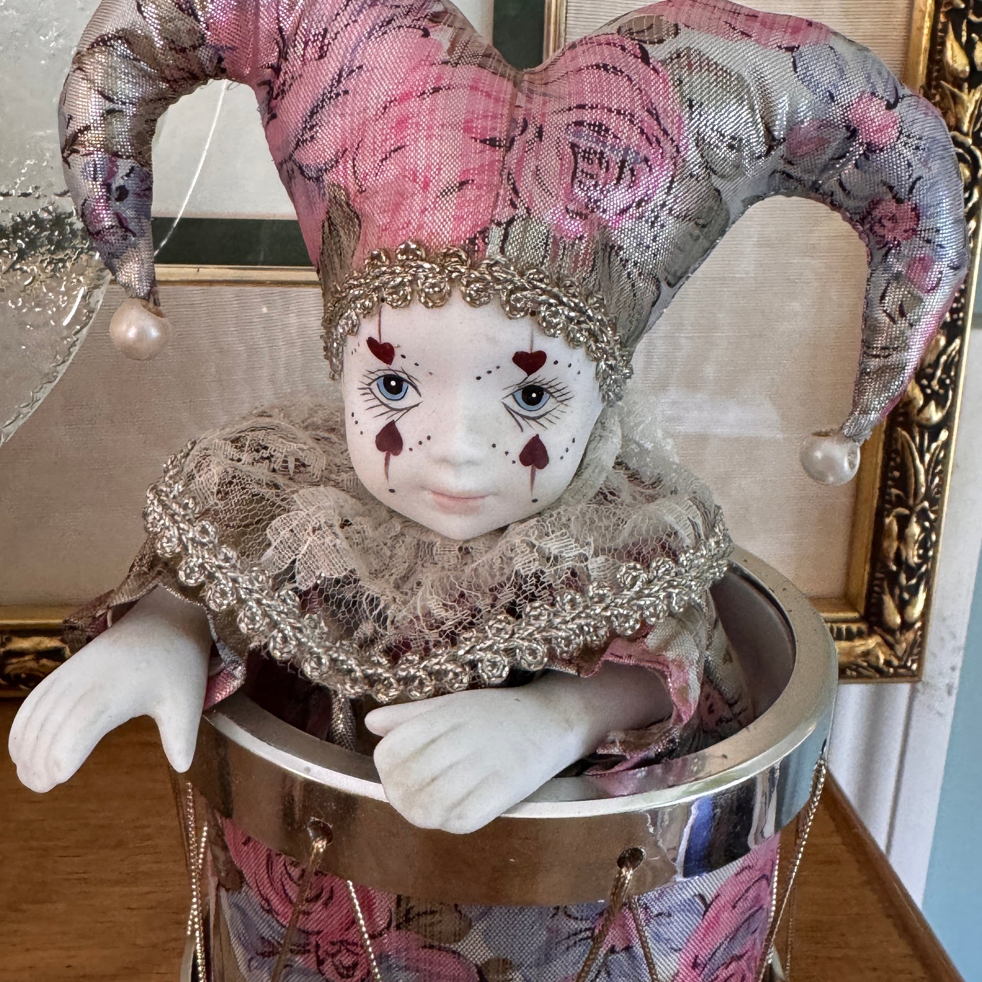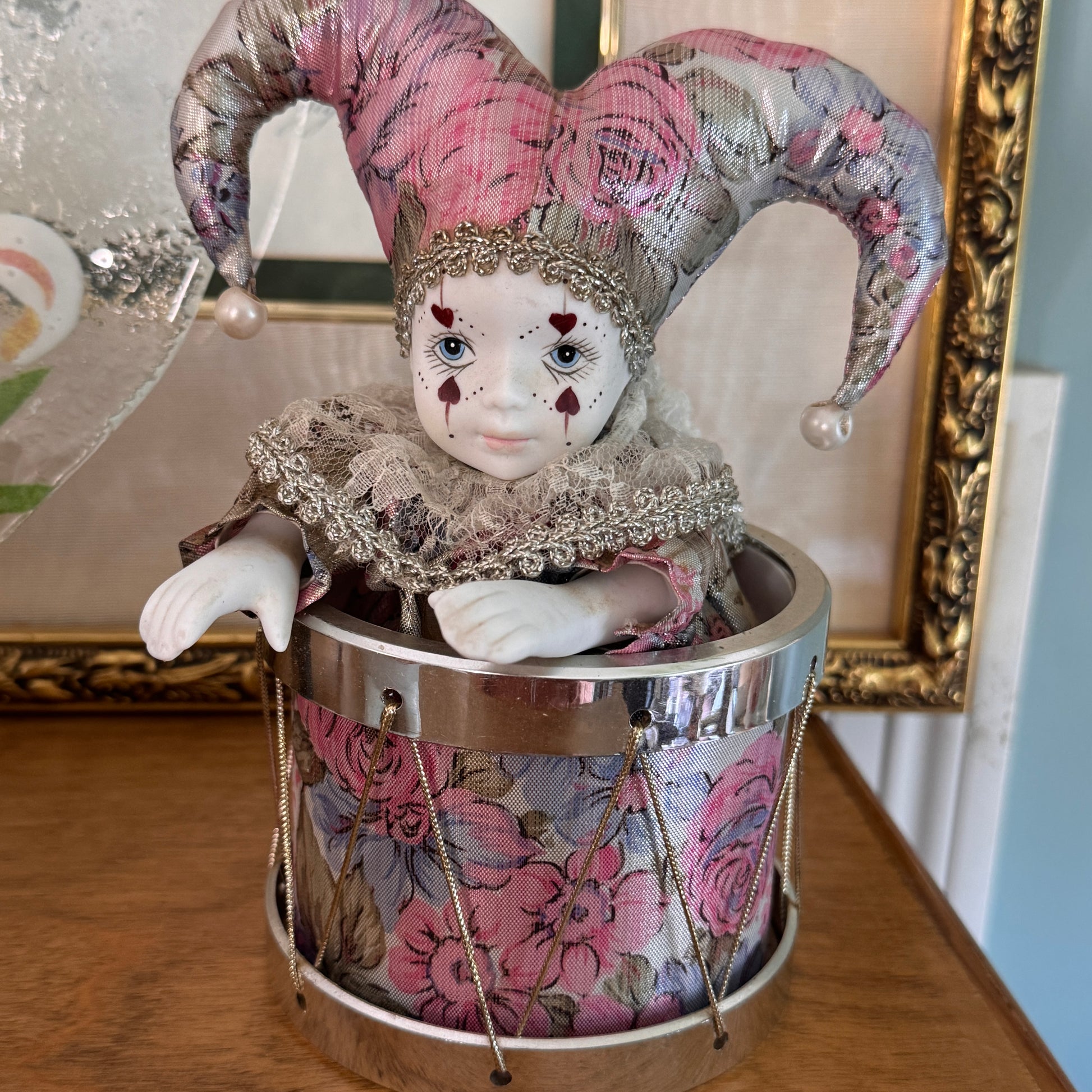Vintage Westland "Somewhere in Time" Jester Music Box. Beautiful jester in pink, purple and silver fabric with hand painted porcelain hands and face and faux pearls on the tips of her hat. Measuring 4-1/2" wide x 6-3/4" high she moves when the music box is wound and the music plays. This jester has a condition issue with some scratches on her silver drum and the lace around her neck is a bit dusty and has stretched out a bit over time. The music box still plays albeit a lttle slowly.