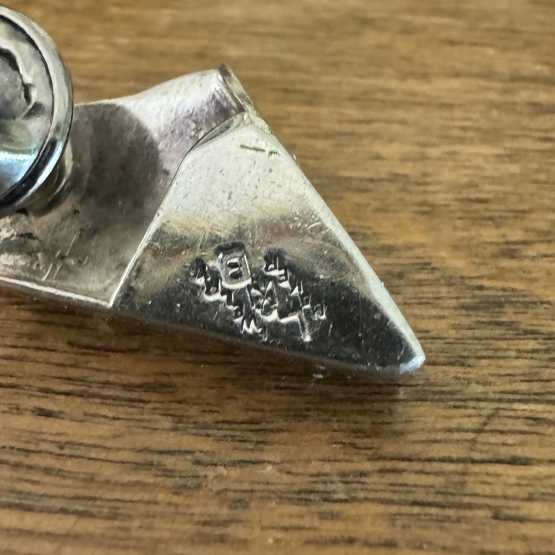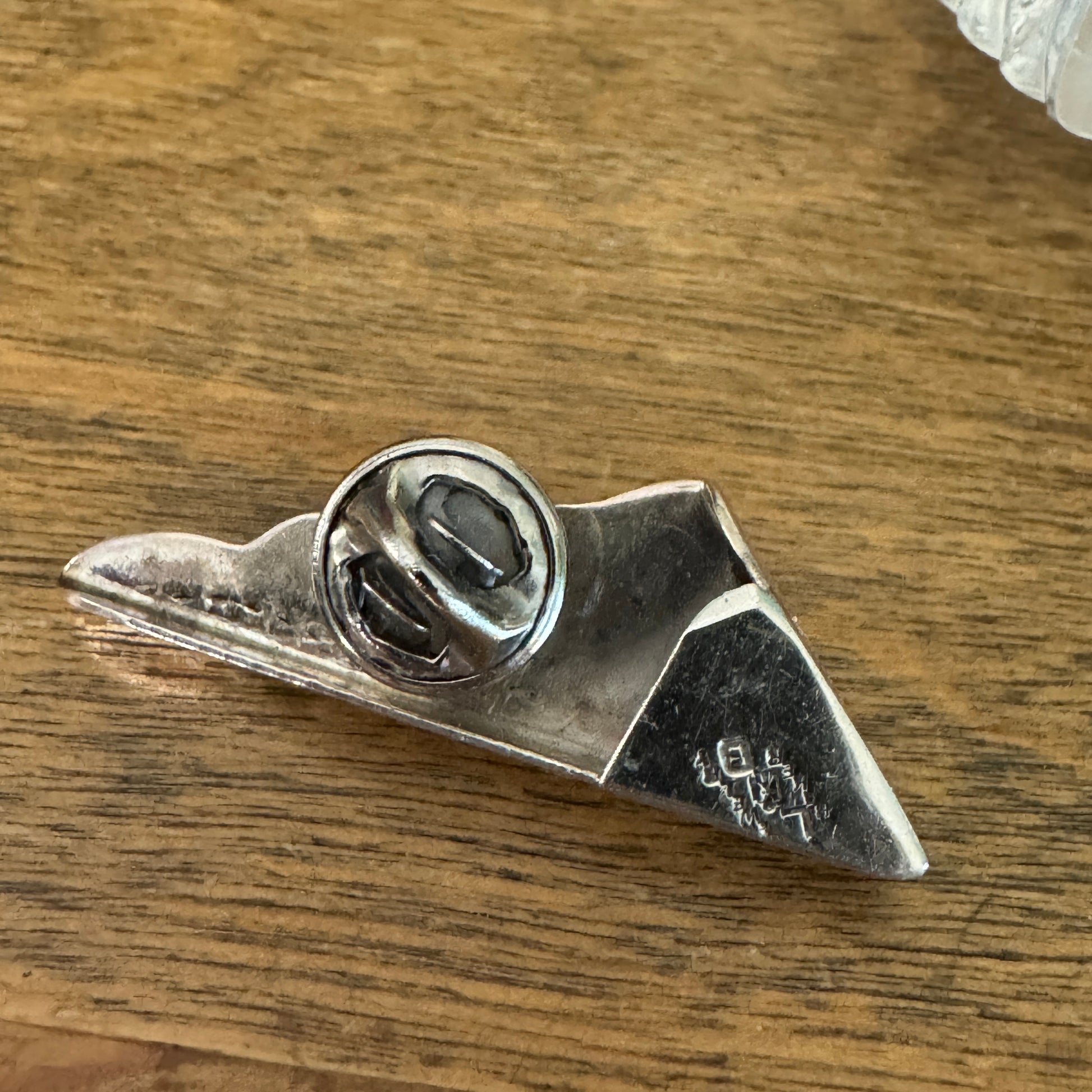 Vintage Signed Les Baker Navajo Sterling Red Coral Collar Tip or pin This is only one sterling collar tip with an oval red coral cabochon that forms the flower of the sterling silver leaves on this collar tip. The back is marked with L Baker and his maker mark and includes an attachment to hold it in place. The sterling silver collar tip measures approx. 5/8" wide x 1-7/8" high x 1/4" deep and comes with a snap on cover.
