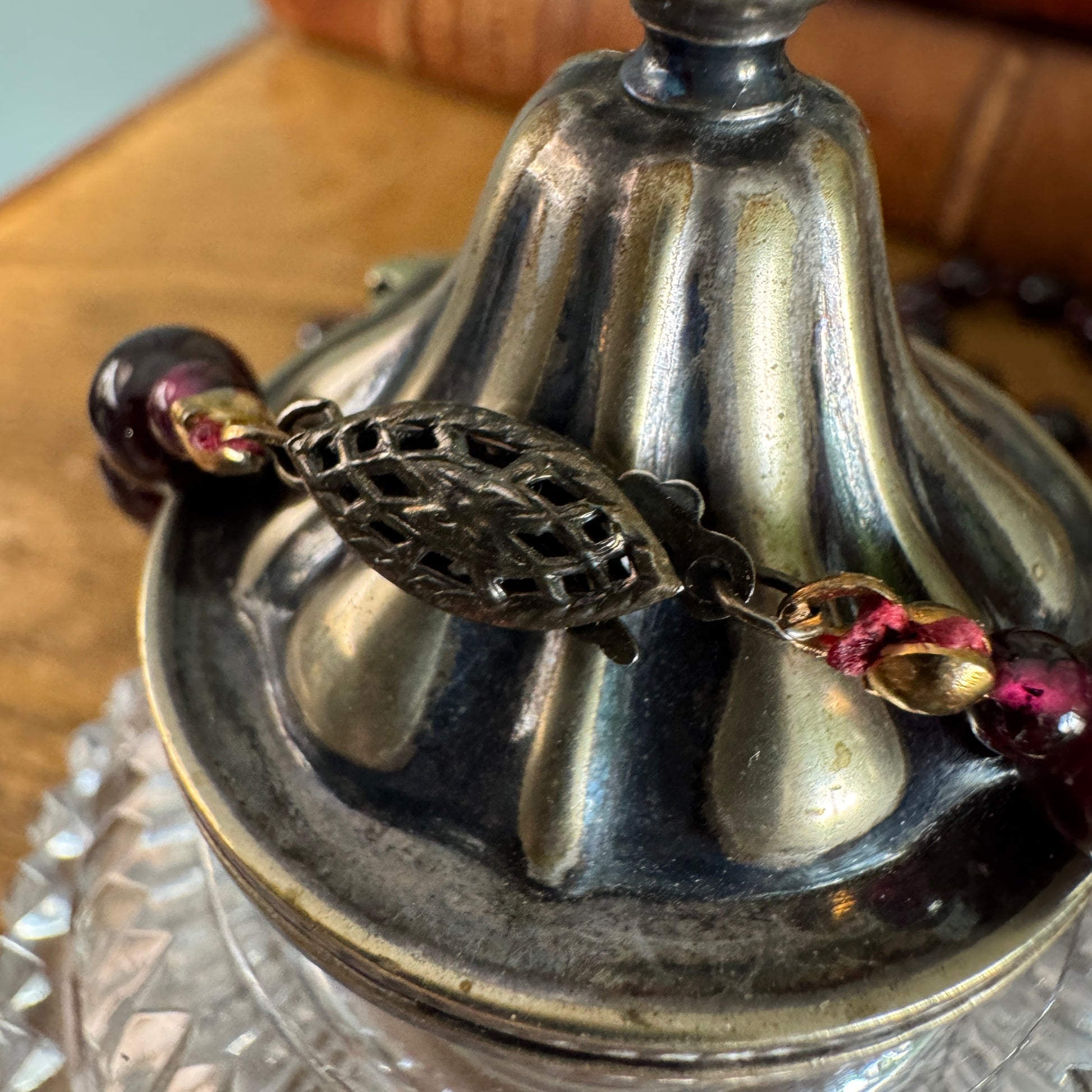 This vintage collection includes a necklace and bracelet made from deep purple amethyst semi-precious gemstone beads. The necklace measures 24" with a gold-filled filigree clasp ( marked 14/20) and features alternating larger 7.19 mm amethyst beads and smaller 3.38 mm spacer beads. The amethyst beads test to amethyst. The matching bracelet, 7" long, is equipped with a newer 14k gold replacement clasp and follows the same design pattern with 6.75 mm larger beads and 3.21 mm smaller spacers. While the clasps differ, both pieces showcase the same high-quality deep purple amethyst beads for a harmonious and elegant set.